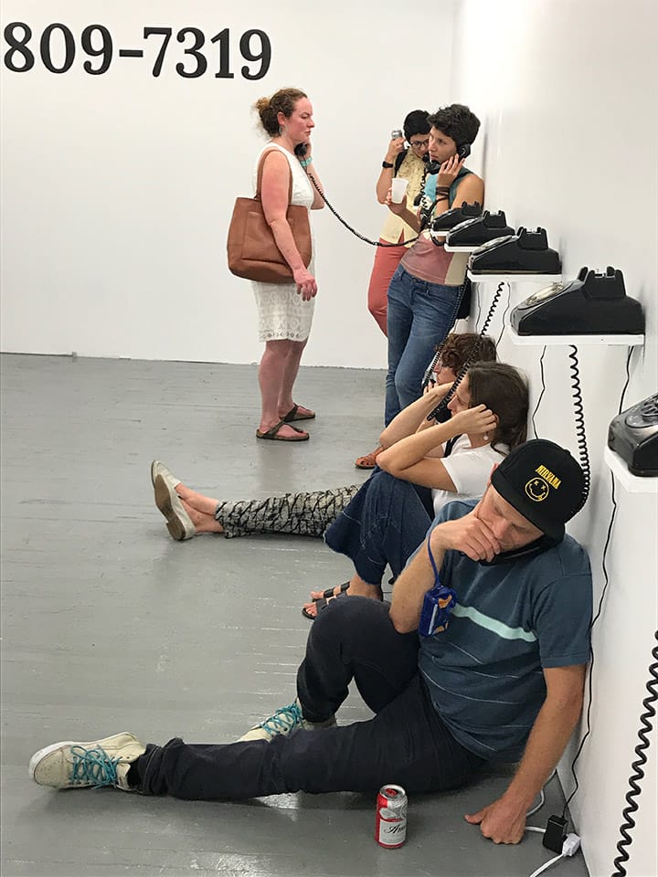 In the gallery, it’s easy to lose track of time, absorbed in listening to confessions that range from heartbreaking to uplifting to chilling; more than once I caught myself wincing or laughing out loud. Most of the stories I heard were voiced by young women, seemingly from all over small-town America (based on their accents and the locales they described). As they talked, I could sometimes hear ambient noise in the background or indicators of the time of day, and I envisioned scenes like a dark bedroom in the middle of the night with a flickering, low-lit TV screen. There were moments when I yearned to help the person on the other end by offering advice, and others when the confessors beckoned back, wishing they could hear breathing or other signs of life. Sometimes, the otherwise silent presence of the original listener became apparent, as they hung up on a confessor just as the story was getting good, leaving visitors in the gallery to wonder about the outcome.