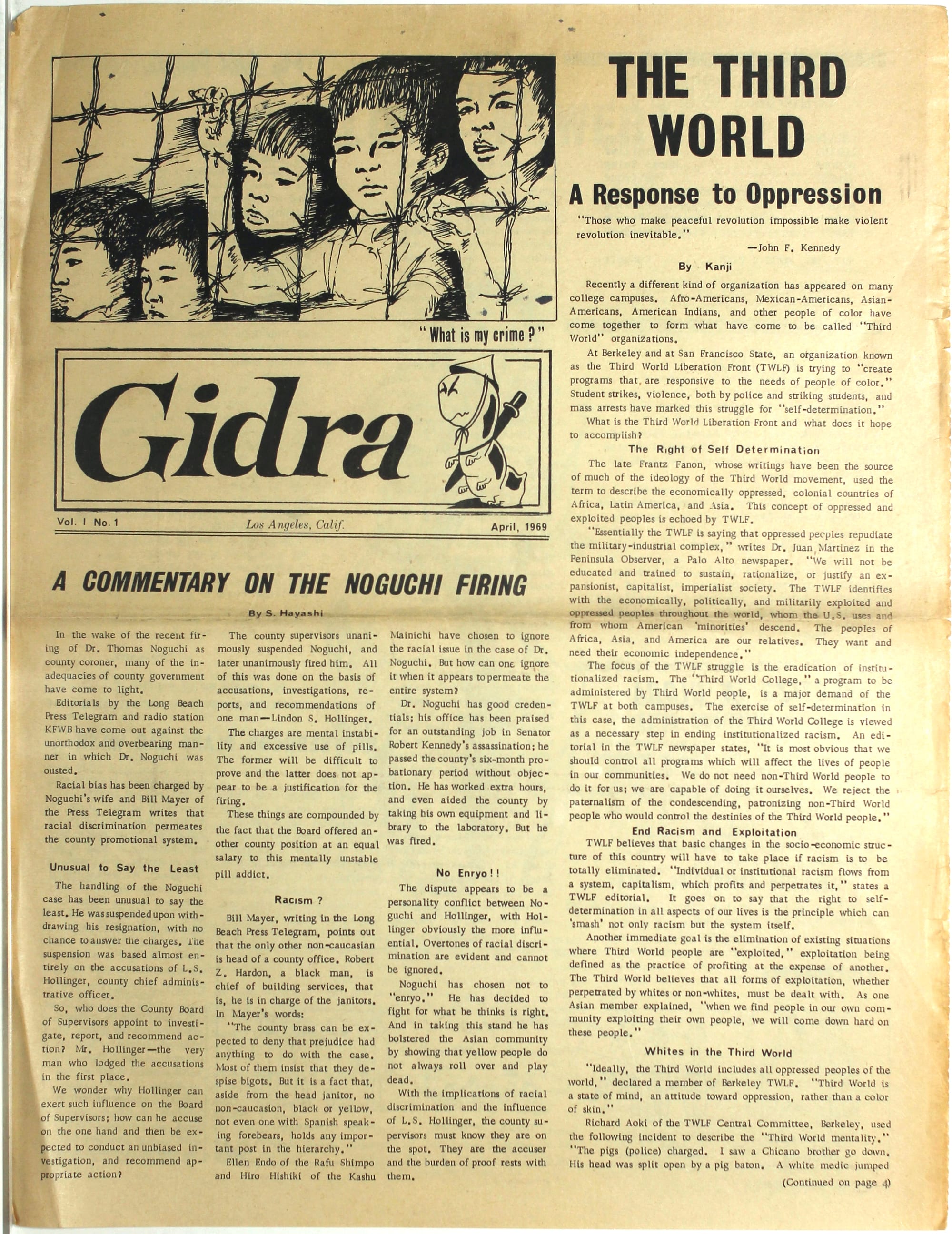 From the outset, Gidra was driven by a sense of urgency and curiosity, turning away from the rigid codes of professionalism and respectability. They outlined their intentions for the paper in their mission statement: “Truth is not always pretty, not in this world. We try hard to keep from hearing about the feelings, concerns, and problems of fellow human beings when it disturbs us, when it makes us feel uneasy. And too often it is position and power that determine who is heard. This is why GIDRA was created. GIDRA is dedicated to truth.”