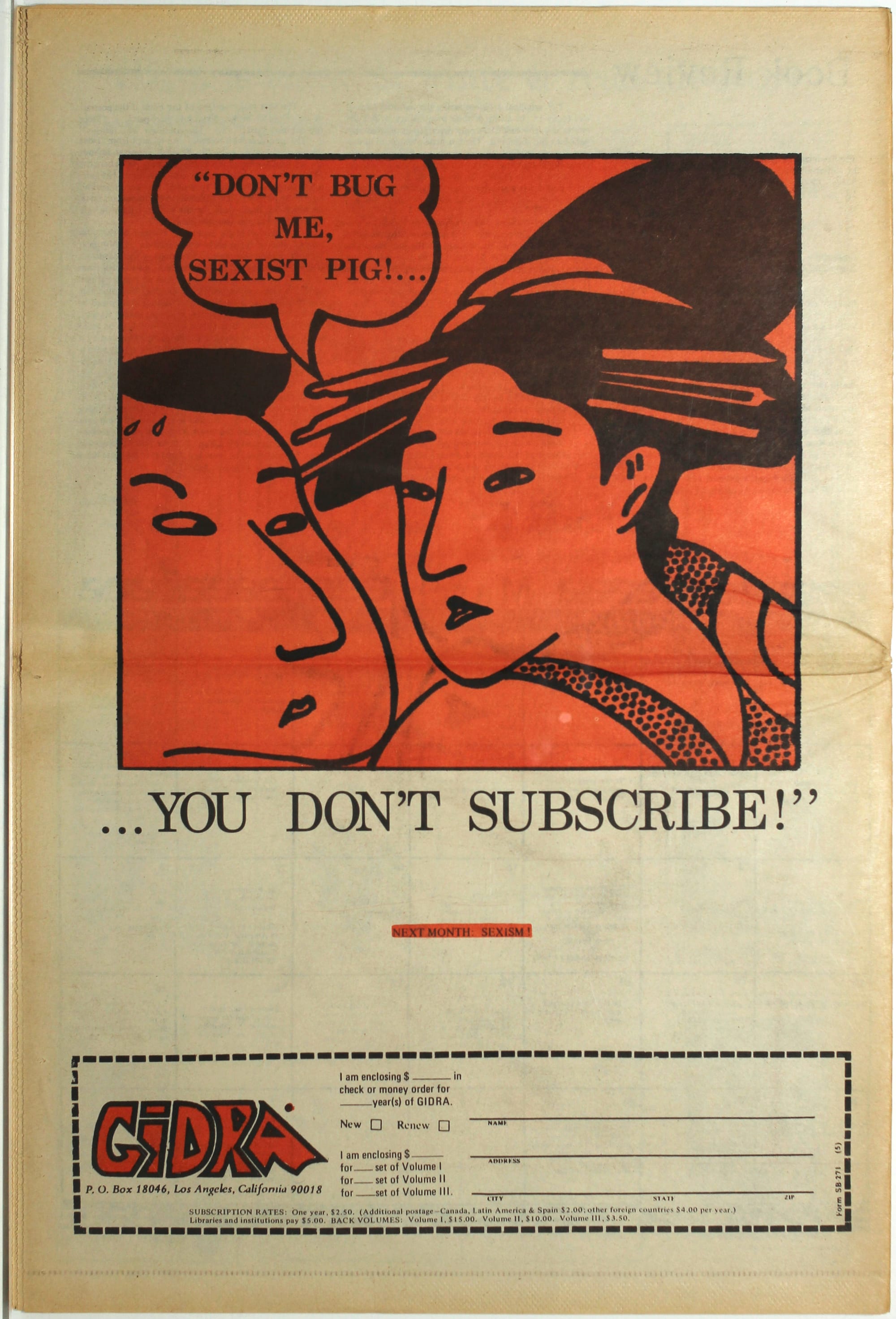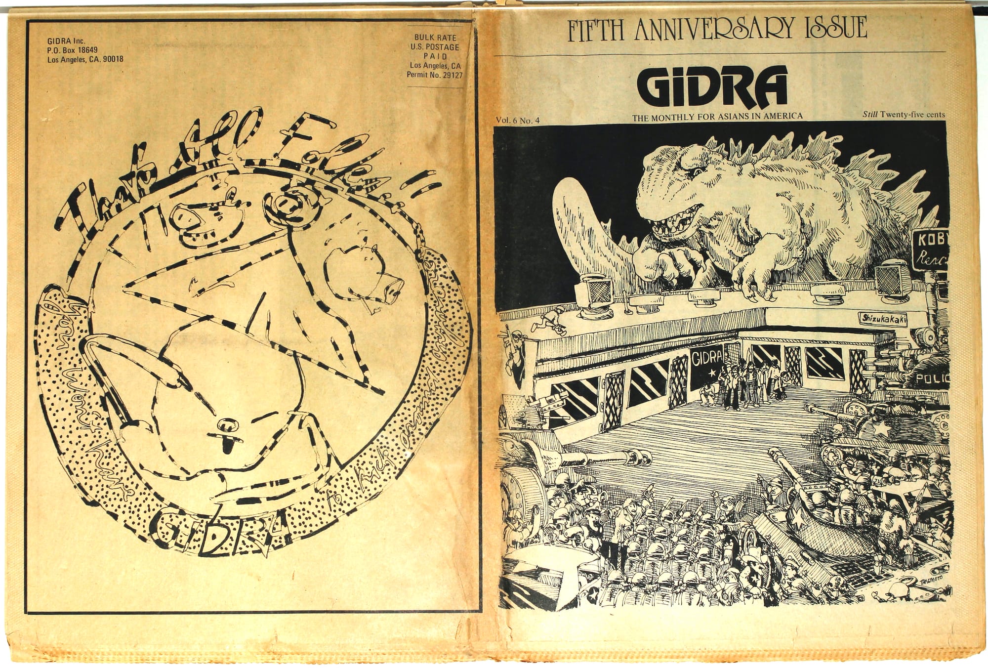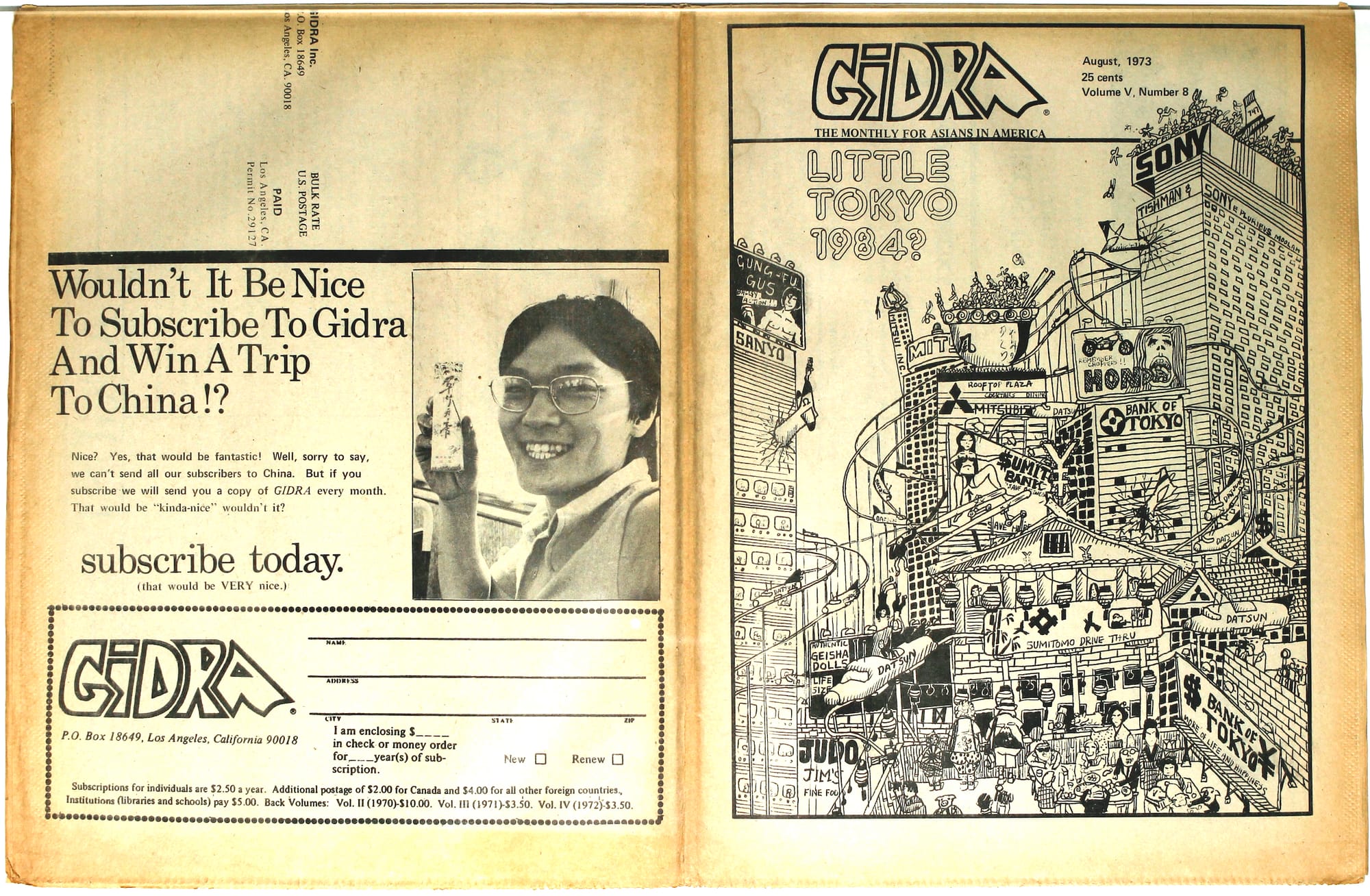 The design reflected the range of perspectives and styles present at the paper. Over 200 volunteers cycled through the Gidra offices, and the paper delights in the dynamism of its contributors. Murase, who today directs the community programming at the Little Tokyo Service Center, recalled that though the paper worked with a core group of artists and art students, most of the original art was sourced from “activist-artists without formal training.” And some illustrations were created in-house, using images cut-and-pasted from other magazines. “We used ink drawings, Letraset rub-on transfer deals, montages. Anything but the slick commercialism of Madison Avenue ads.” Artists like David Monkawa, Dean Toji, Glen Iwasaki, and Alan “Batman” Takemoto strove for a visual style that enhanced the senses, rather than numbing and nullifying them. The readers appreciated the homegrown style of the paper. “It was folksy, community orientated reporting. It really helped coalesce Asian Americans at the time into a progressive political voice,” writer and historian Susan Parks shared with Los Angeles Magazine.