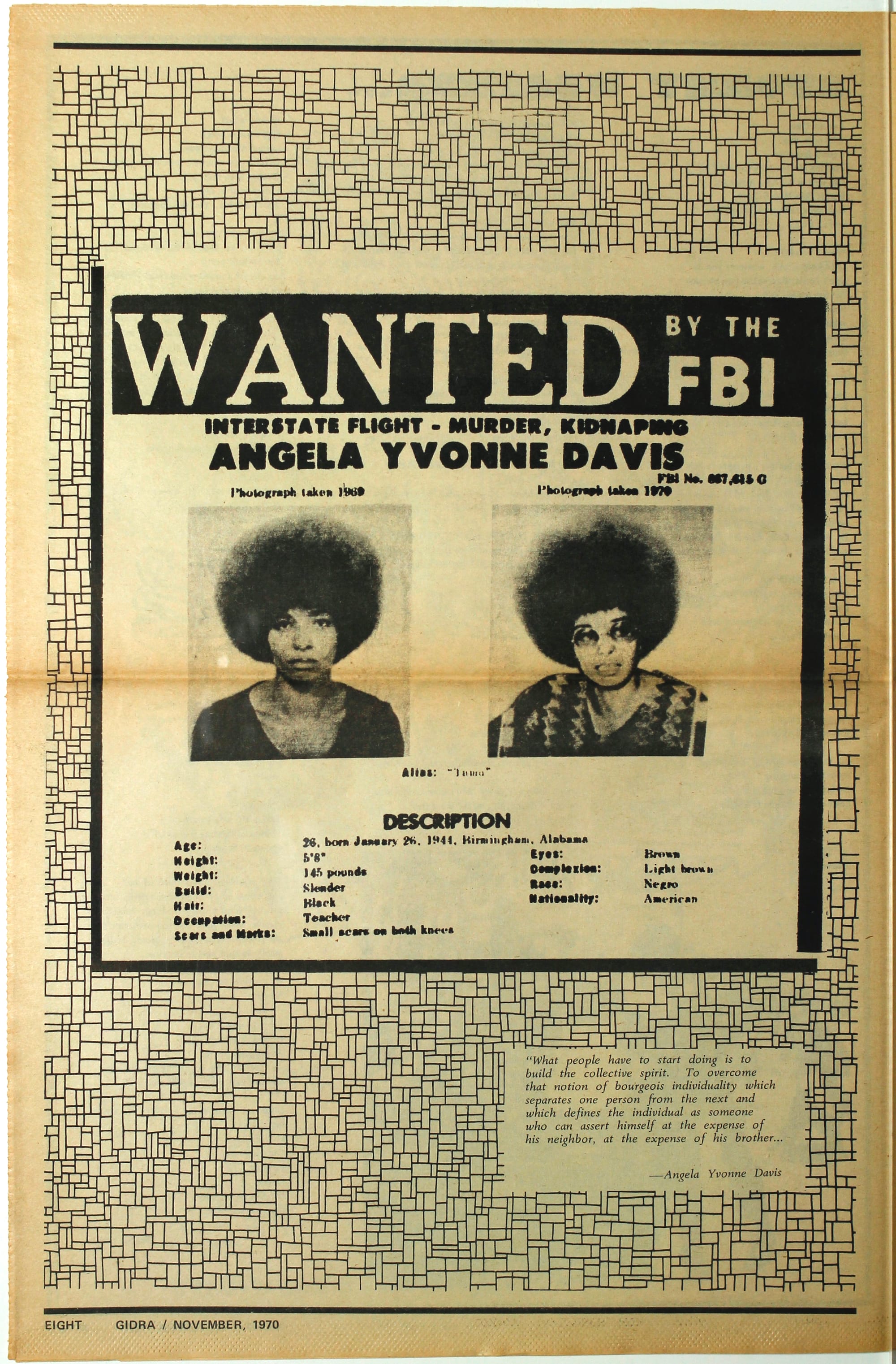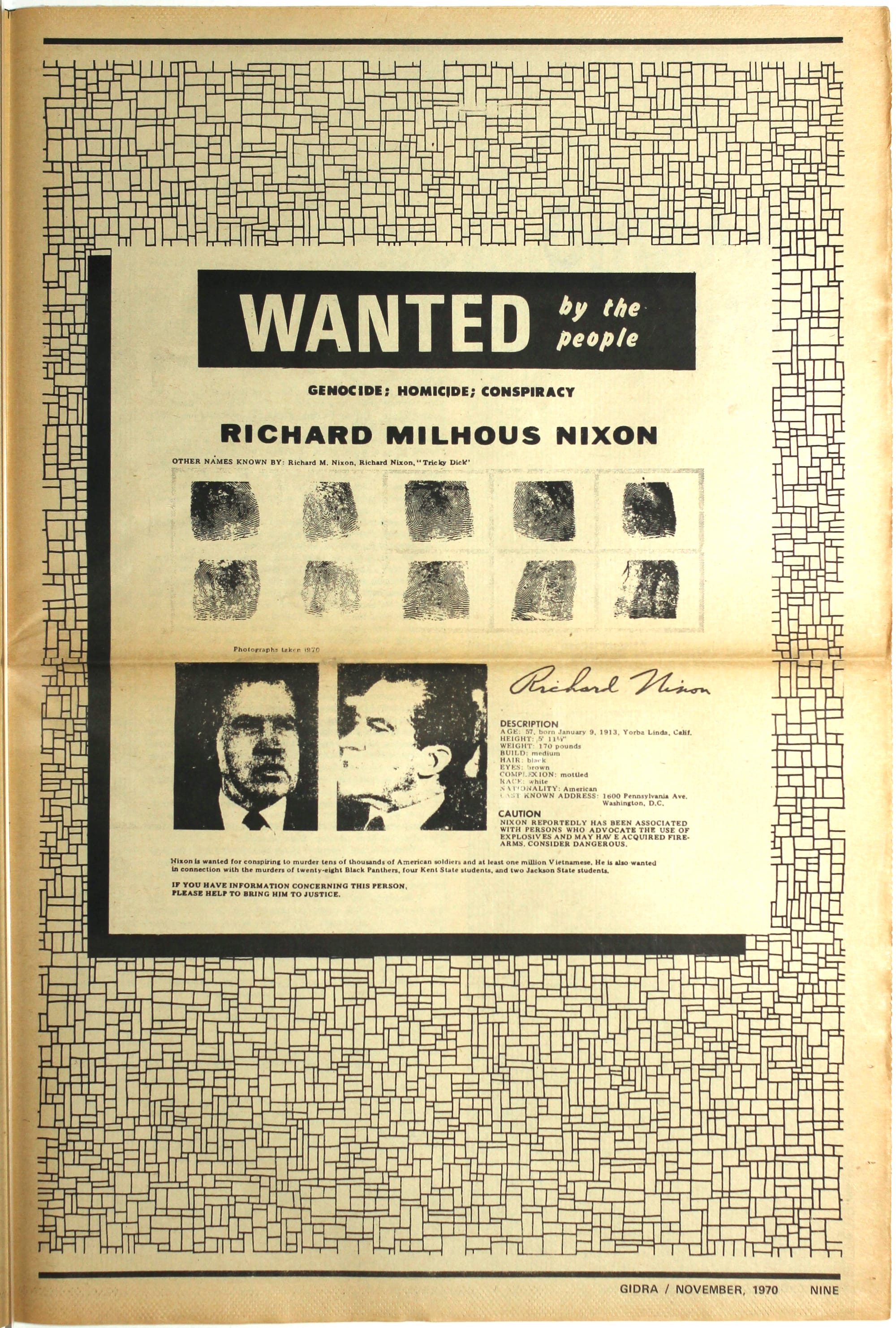 By 1970, Gidra was adopting a more creative format. Staff members like Alan Ota transformed their traditional newsprint approach into an enthralling visual experience. Covers became more prominent, featuring eclectic illustrations and photographs. Because Gidra stressed a non-hierarchical work environment, driven by group discussions and consensus, there was no overarching house design, which allowed for more freedom and play. One spread from the November 1970 issue reprinted the FBI Wanted poster for Angela Davis; on the next page is a mock Wanted ad for then-President Richard Nixon. His crimes include “genocide, homicide, conspiracy.”