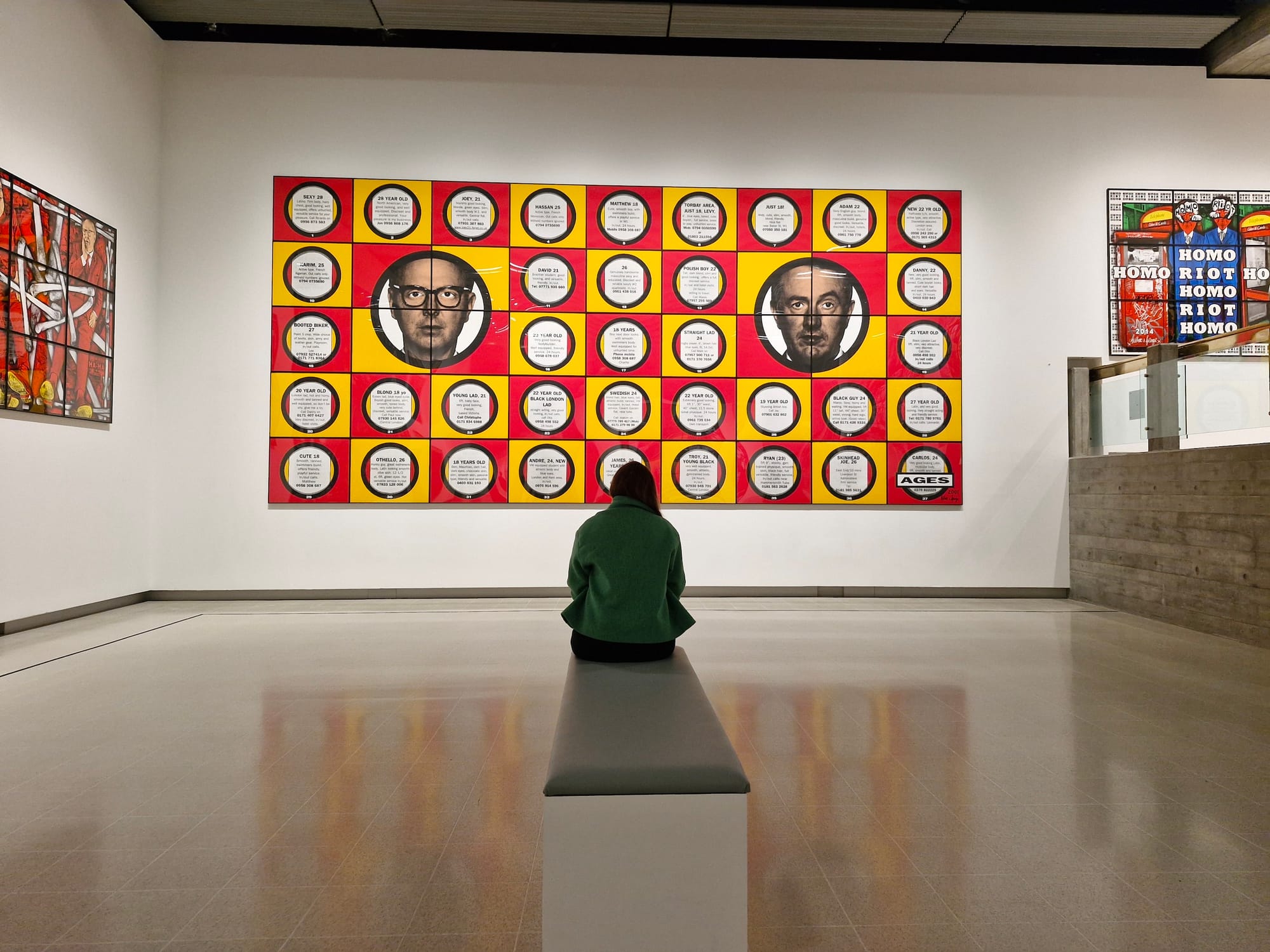 The cult of Gilbert & George continues in the gift shop, where merchandise has gone to town on all the key elements that form their brand: cheeky irreverence in a wooden swear box (“Pay up and f**k off”), duo bookmarks (what do you mean, they don’t both read the same book at the same time?), police-style tape emblazoned with “Homo riot,” and pins that say “free dick.” A little like Jeff Koons, who speaks of the meaning in his works like a true Pop Art salesman, with a Cheshire grin, you have to admire Gilbert & George’s total dedication to being the art: a peculiarly dry and British double act.