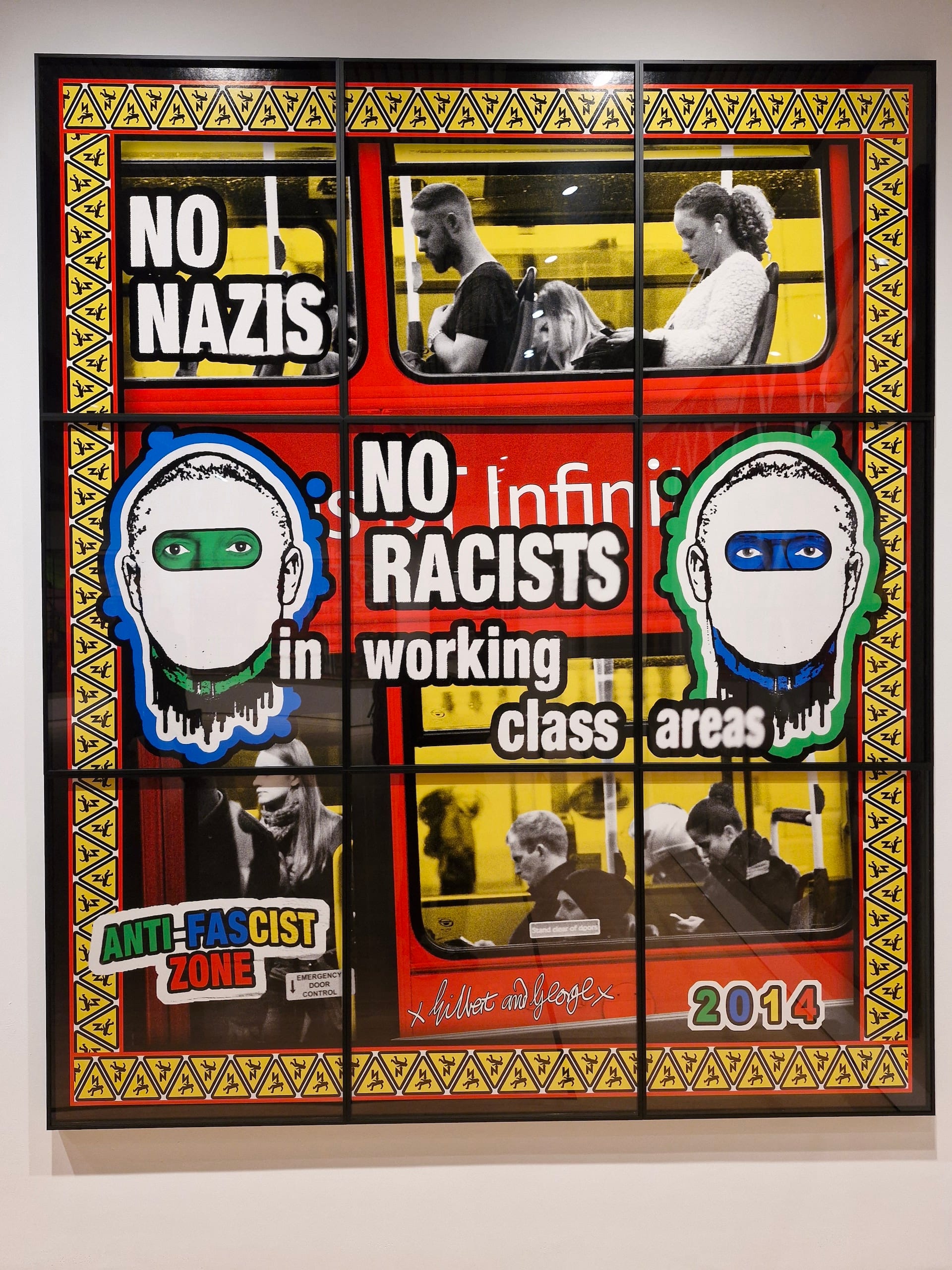 Just enough reference, because — befitting their blaring slogans that shout “No Nazis,” “Homo Riot,” “God loves fucking! Enjoy” (all capitalized, naturally), printed in the infamous British tabloid-style font and accompanied by examples of posters used on A-boards — the works provide no more depth or analysis than the newspapers they mimic. They do not offer a stance or interpretation, or even a jumping off point, as much art attempts to do. Like the singing sculpture, the images just exist. What do Gilbert & George actually think of all these incredibly pertinent and alarming issues plaguing society? To ask that question is to miss the point, darling.