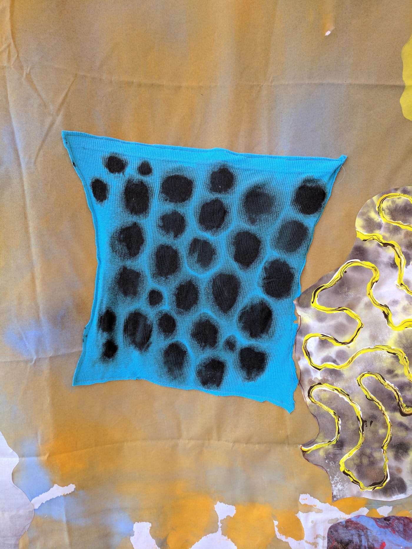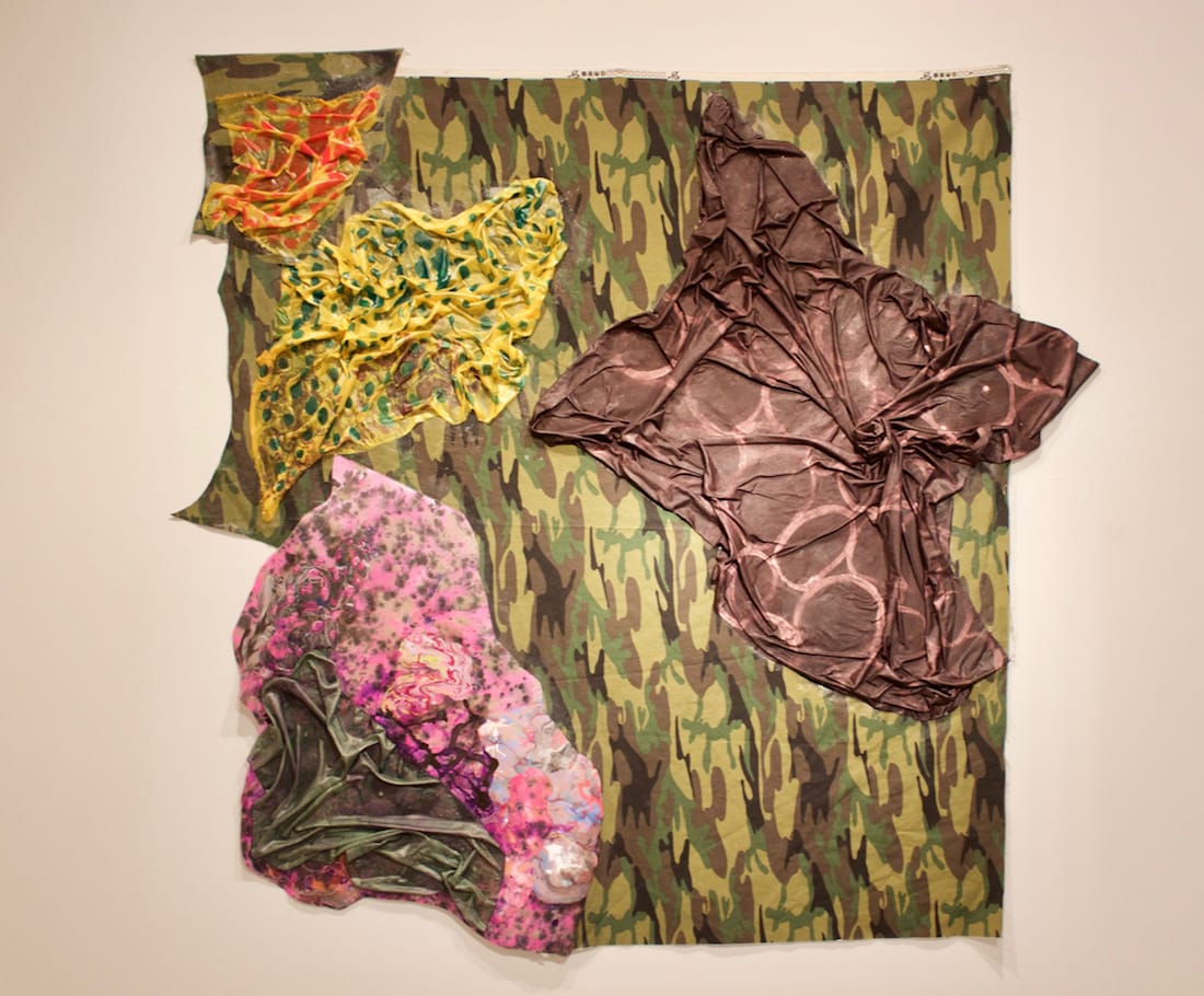 “Casting: Clinging” (67-by-64 inches) also operates according to overt figure/ground relationships, the ground here being a yard or two of camouflage-print cotton in a range of greens and browns. (The presence of the white, unprinted margin along the top edge, at the end of the bolt, might be a funny nod to “truth to materials.”) A few crumpled bits of cloth, painted with patterns of ovals, spots and dots, are arrayed across it, stuck to the surface presumably with acrylic medium. Their placement might seem arbitrary until you notice just how exquisitely they interact with each other and with the camo ground.