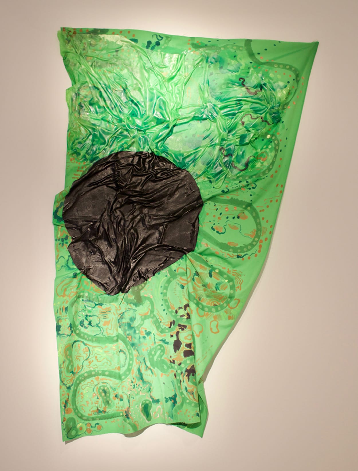 These works are the most recent, according to the gallery. They are tougher, less solicitous about our opinion or eager for our approval. Like the artist’s earlier paintings on Mylar, they are attached directly to the wall, but illusionism is banished completely; the pictorial space is flattened, reduced to the physical depth of the fabric’s conspicuous wrinkles and bulges. With its rumpled disk of black amid a patterned field of subtly varied greens and a neutralized orange, “No Recall” (2017, 71-by-43 inches) is relatively simple, even reductive. If “Patchwork Infinitum” is a run-on paragraph, “No Recall” is a simple declarative sentence; if the former evokes an enormous, detailed map, the latter looks more like a flag.