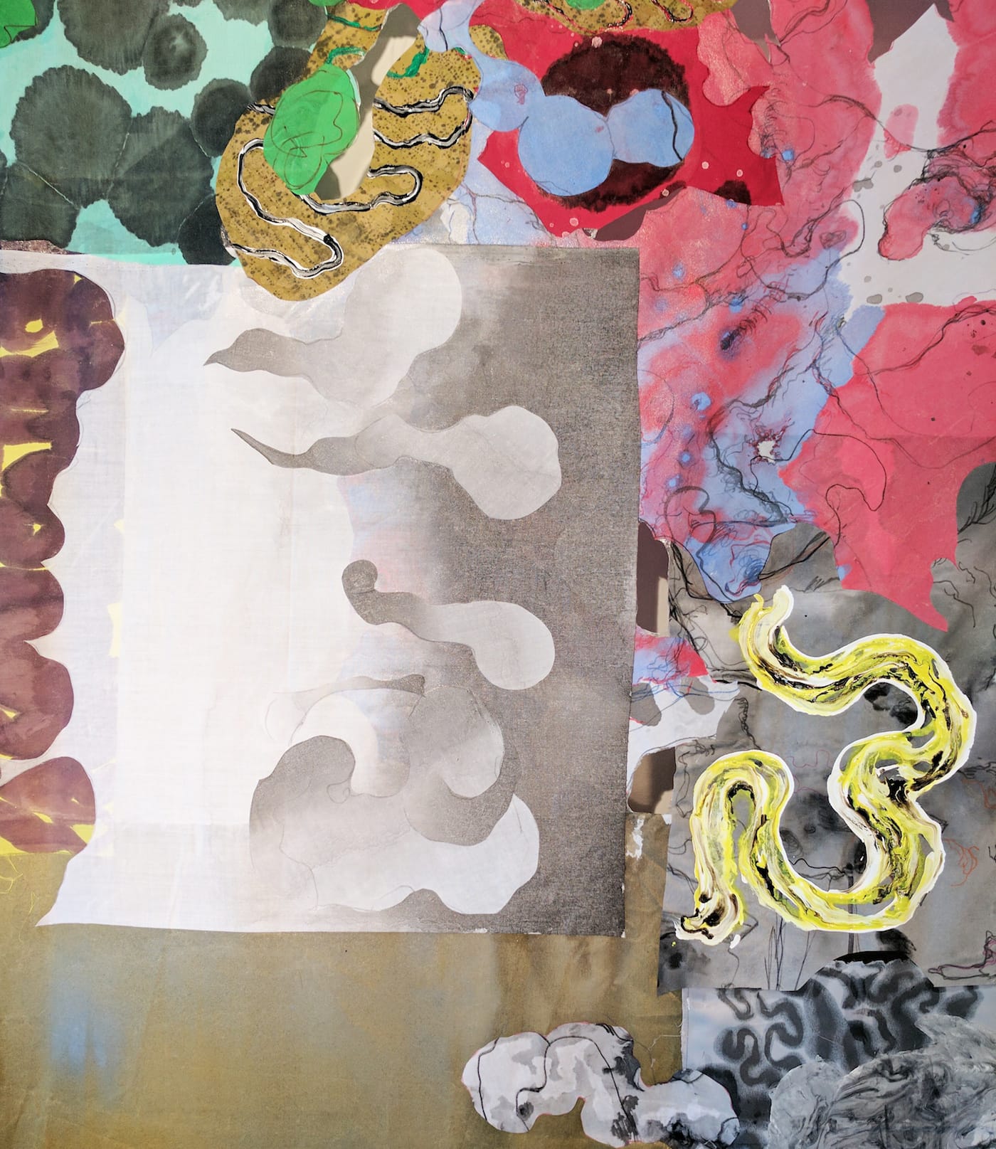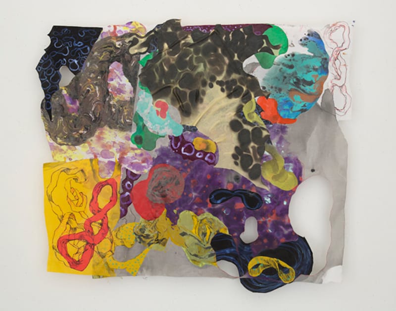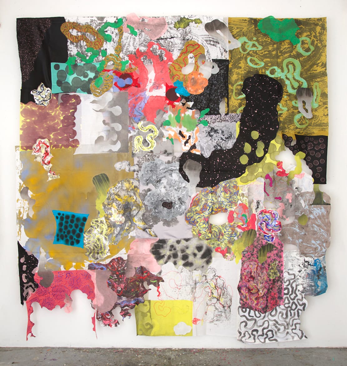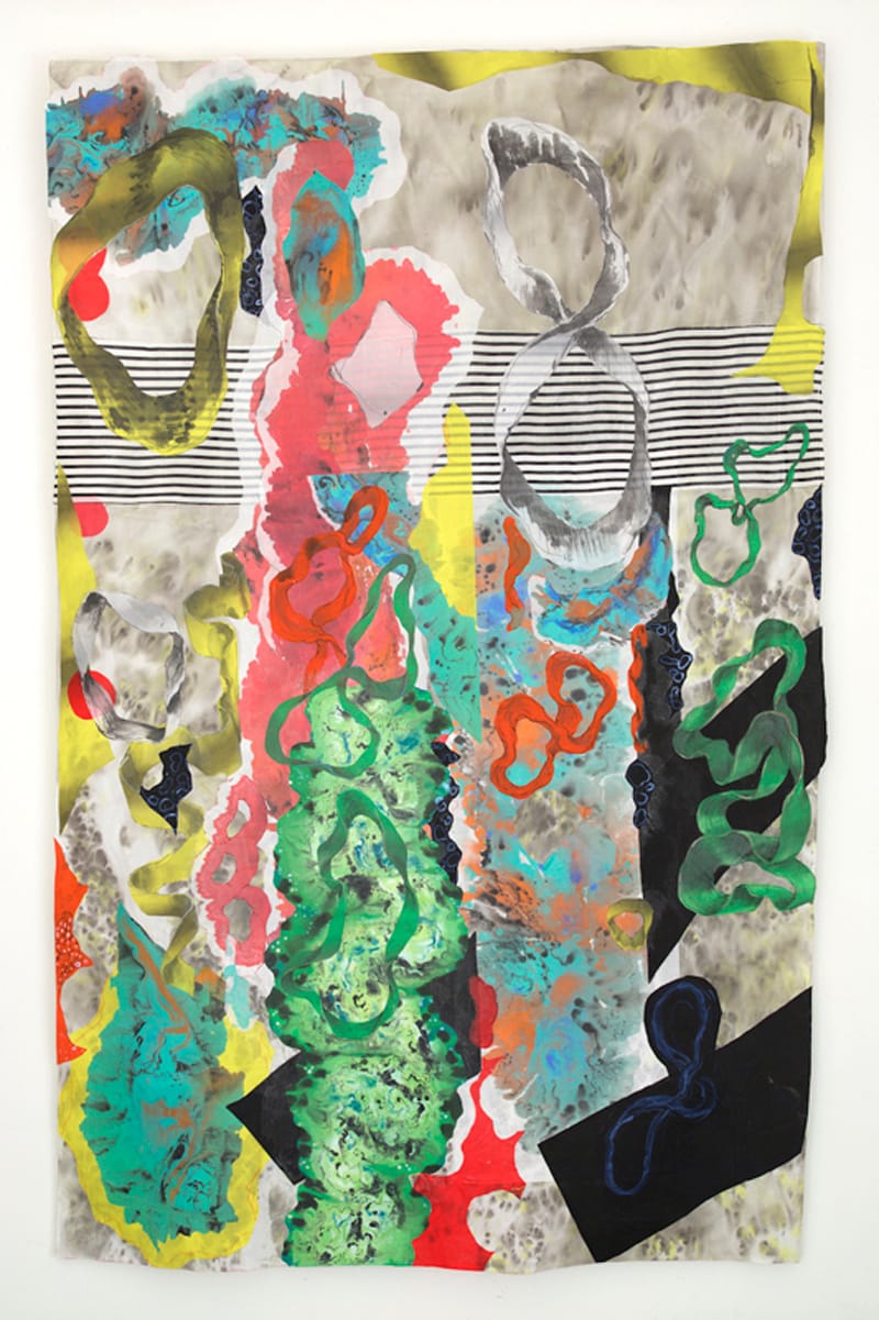 And dazzle she does, in works such as “Patchwork Infinitum” (120-by-117 inches; all works acrylic and ink on cloth, 2016 unless noted), an ambitious and beautiful collage-painting of enormous formal energy. Hanging curtain-like from a single horizontal crossbar, it is a wildly exuberant collection of incidents and effects, distinct passages grafted onto one another in a glorious profusion of blots, dots, curlicues, serpentine lines, billowing clusters of pod shapes, and slithering teardrops.