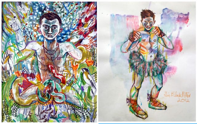Another work, “Fragmentation” (2012), should be submitted to urban dictionary to illustrate what Drag Queens mean by fierce. A young man wears a tutu, sandals (ballet shoes?), gloves and nothing else. Wild streaks of fluorescent color swirl across the picture plane disregarding the boundaries of his silhouette. Clouds of color bleed into one other in the background, threatening to upstage our ballerino. These formal devices don’t give a shit about the rules, or perhaps they follow their own invented dictums. It is a brazen and brash style that reinforces the rule-breaking content.