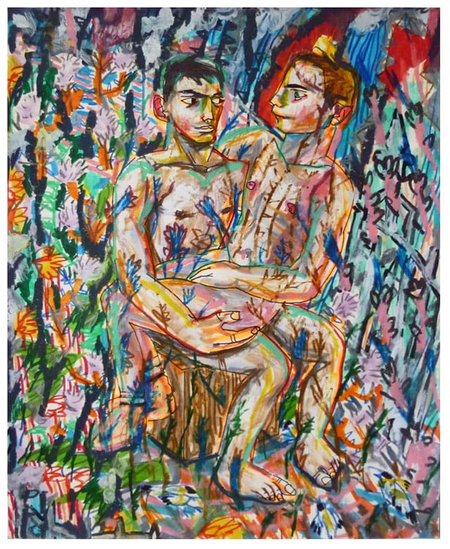 Gio Black Peter’s landscapes look like a field of Fleur-de-Lis on acid. Like the medieval tradition of cramming as many little flowers as possible into a landscape, exemplified by the Unicorn Tapestries at the Cloisters, no space is left bare — horror vacui. The acid comes in with the bright colors and jagged lines that depict the field in Black Peter’s work. In “Resuscitate” (2012), the two men almost get lost in a heavy thicket of weeds and flowers. The artist’s sweet spot for gardening reveals itself in his passion for rendering each small petal, leaf and stem in his rich idiom of glowing color and chaotic line and glowing color.
