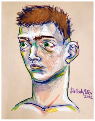 Black Peter grasps that a little neon goes a long way. There can be too much of a good thing and generosity towards bright colors can backfire into garishness. A point not lost on this artist. Employed selectively and strategically in his mixed media drawings, these glowing spots shine like stars in a dark sky. “Cry Baby” (2012) captures the moment right before a boy begins to cry with ironically glowing highlights. Most of the picture is built up with acrylic, oil pastel and colored pencil. Against these more opaque and tame tonalities, the streaks of fluorescent marker can scream.