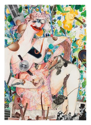 In A Girl in the Arbor, Nilsson’s her most recent series, which consists of thirteen works done on large sheets of paper (41 ½ x 29 ¾ inches), the artist uses watercolor, gouache, colored pencil and collage. It is difficult to combine these different materials, particularly the shiny printed images and the watercolor, but Nilsson pulls it off without a hitch. A single zaftig female dominates all the works in the series. She is situated in a space that is vertically divided by blue or green tree trunks, and between them, a background pattern of rounded, leaf-like shapes, which reminded me of the leaves in Claude Monet’s water lilies. The floor is made up of collaged pages, whose torn-up texts seem to have to do with snakes. The collage elements function in myriad ways. In “Girl in Arbor #3” (2013), speckled eggs are the woman’s breasts. She is seated on a chair, her oversized legs are spread a little far apart and the dress is a little high, so you can see the rolled tops of her stockings, which Nilsson indicates by collaging photos of a ring and bracelet around her lower thigh.