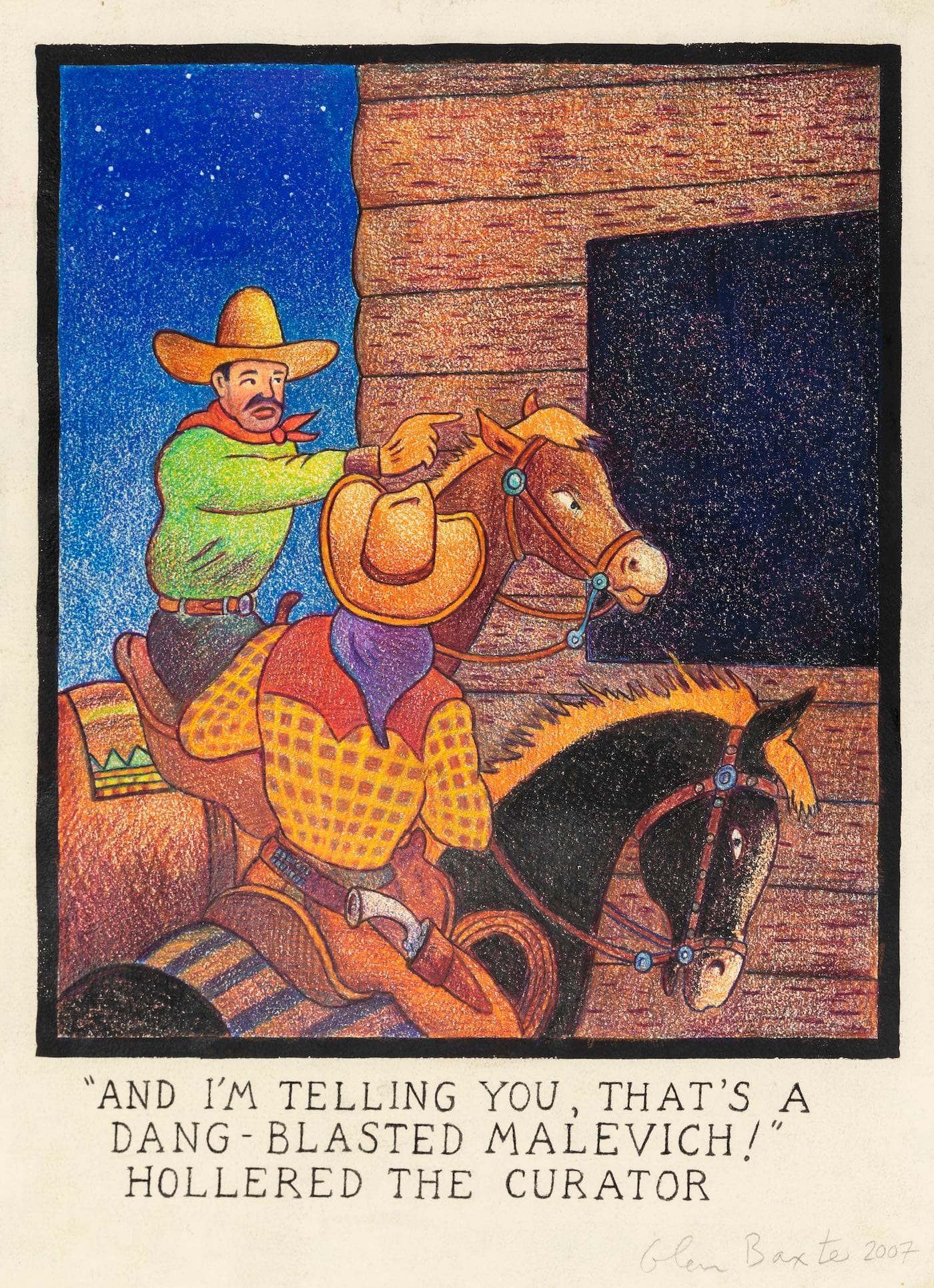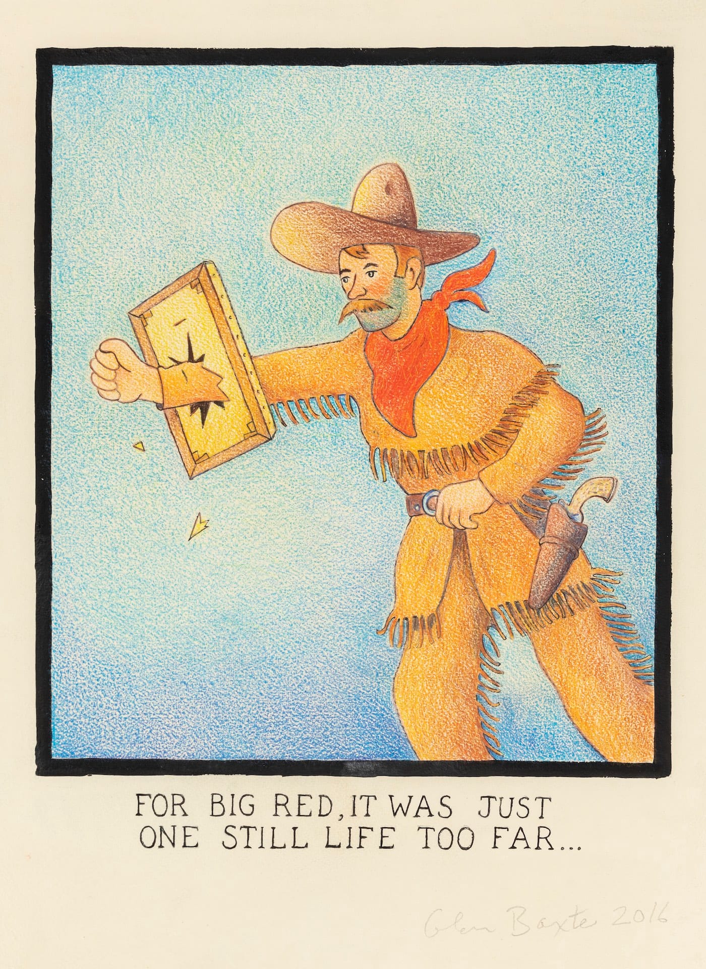 So what are these works in the show today? As fairly customary, Glen is taking a tilt at the absurdities of the fuzzy, whizzy showbizyness of the art world. He’s been doing this for years. Remember, quite early on, that spread-legged cowboy, Stetsoned, bandanna-ed, low-slung-gunned to the nines, standing with his back to us, staring at a blank canvas by a Ryman or some other modern American showman/roustabout big in the auction house? The gunslinger’s frozen to the spot. His arms are about to wheel helplessly in the air. No well-greased bullet will avail him. Never in his life on the prairie has he been confronted by such a barefaced object of menace, fraudulence, and emasculating perplexity as this blank canvas which costs so much and promises so little. The caption, as bald as it is simple, reads: It was Tom’s first brush with modernism.