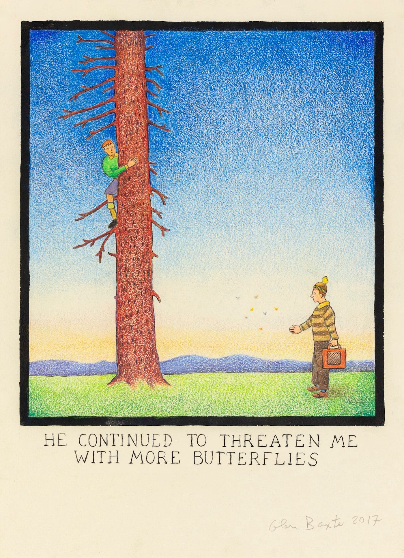 Some while ago, the great American poet John Ashbery tried to nail down Baxter’s lineage by naming the names of a few like-minded scribblers and daubers from the past. This is what he came up with: Lewis Carroll, Sax Rohmer, Marquis de Sade, Raymond Roussel, Luther Burbank, and the Comte de Lautréamont. The young Baxter got his first big break in the US in 1974, when Ron Padgett and Larry Fagin invited him to read his poetry at St Mark’s Church in New York. A subsequent show at the Gotham Book Mart Gallery came to the attention of Edward Gorey, who became an early champion. And so it has gone on.