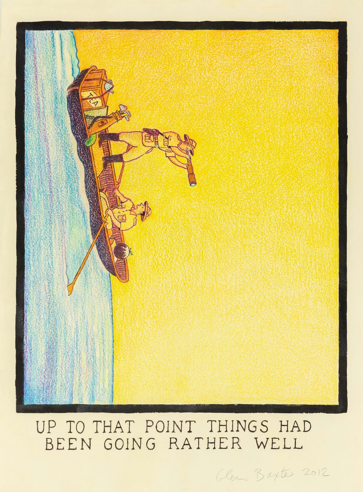 Unflinchingly Gamboge: the Selected Works of Glen Baxter continues Flowers Central (21 Cork Street, London, England) through Febuary 1.
