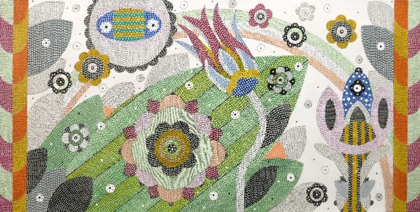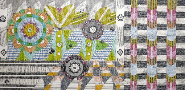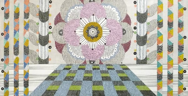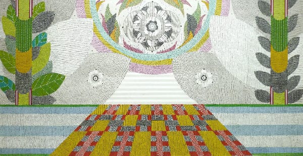 The three flanking columns in the painting’s immediate foreground, as well as the flanking ones in the background, both frame and further define the space. Made of dots, the leaf-like shapes — think swarm of bees in formation — joining both sets of columns collapses the space, while the tilting plane pushes it open. At the same time, that same plane us in, until our eyes meet the floral motif, which seems as if it’s made of light (transparent washes) and sand (the dots). Here, another contradiction arrives — the symmetrical shape is both substantial and insubstantial, a vision.