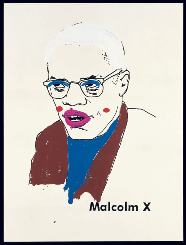 However, Ligon found that these icons were no longer so widely familiar: without an historical awareness of these figures and their roles, the children felt free to depict them in any way they wanted — for instance, a white-faced Malcolm X wearing clownish makeup, enlarged by Ligon to epic proportions (pictured above left). As the artist noted in a statement for his Walker exhibition, “I [love] children’s drawings because kids’ relationship to culture, language, and identity is not yet fixed. They haven’t yet ingested all the rules and prohibitions that adults have, so there is no one way that things have to be in their drawings.”