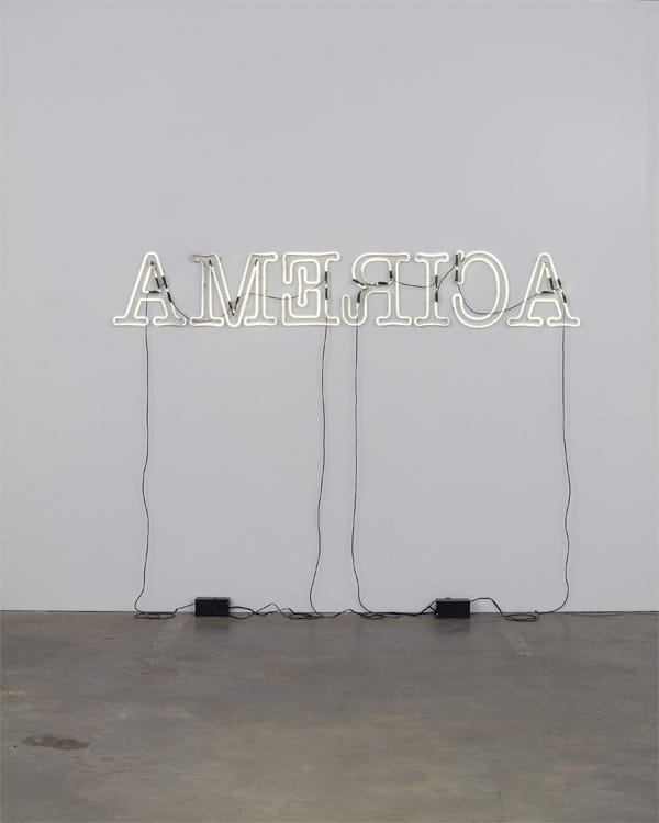 In his invocation of the term, Ligon complicates the relationship between work and viewer: is it the viewer who occupies the rückenfigur role, facing the landscape of America symbolized by a malfunctioning neon sign, or instead the sign itself, which looks out onto the reality of the nation? The signs both conclude the exhibition and repeat its subtitle, simultaneously probing the idea of “America” as an unwieldy construct and framing his examinations of race, gender and sexuality as universal concerns rather than marginal ones.