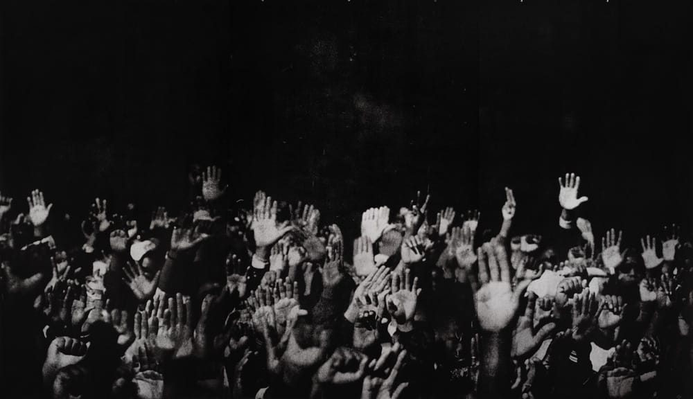 It is perhaps telling that the first piece in the exhibition Glenn Ligon: AMERICA, the most comprehensive exhibition of the artist’s work to date, is not one of the text-based paintings for which he is best known, but “Hands” (1996), a massive canvas tacked to the wall of the exhibition’s entrance with pushpins, bearing the image of outstretched palms against a black background. Drawn from a mass-media photograph of Benjamin Chavis and Louis Farrakhan’s 1995 Million Man March, enlarged to the point of degradation and then screenprinted, what appears here is a copy of a copy of a copy, an image that can no longer articulate what it once represented.