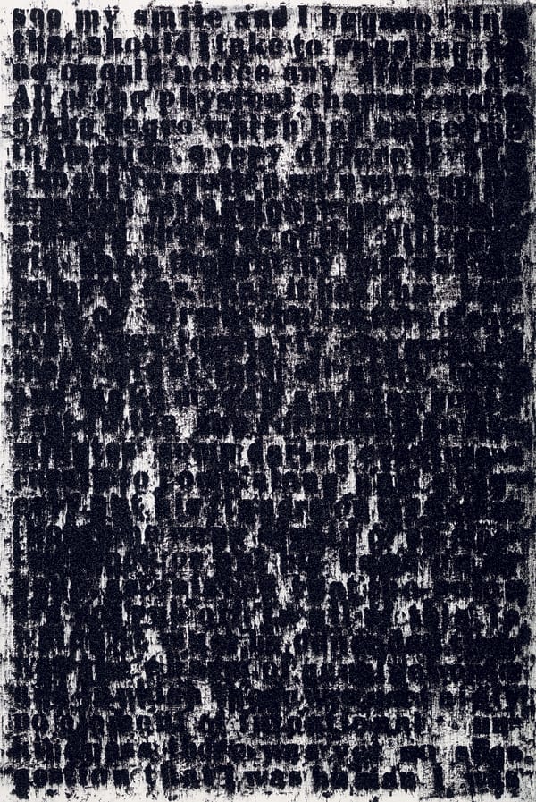 In his signature text-based “Door” paintings, bits of text appropriated from various sources — Zora Neale Hurston, Jean Genet, Ice Cube, Jesse Jackson — are repeatedly stenciled in thick, black oil stick on white wooden doors, becoming increasingly illegible as the text begins to accumulate until the words become muddy smears; the movement from clarity at the top of each column toward disorder at the bottom seems to allude to the ways in which what appears to be a simple statement is in fact tangled in a complex web of associations. In isolating fragments from longer texts — “I found my voice, I lost my voice,” “I’m turning into a specter before your very eyes and I’m going to haunt you,” “I feel most colored when I am thrown against a sharp white background” — with no suggestion of their original contexts, Ligon transforms language into a kind of abstraction, repeating the text until it is effaced by its own proliferation.