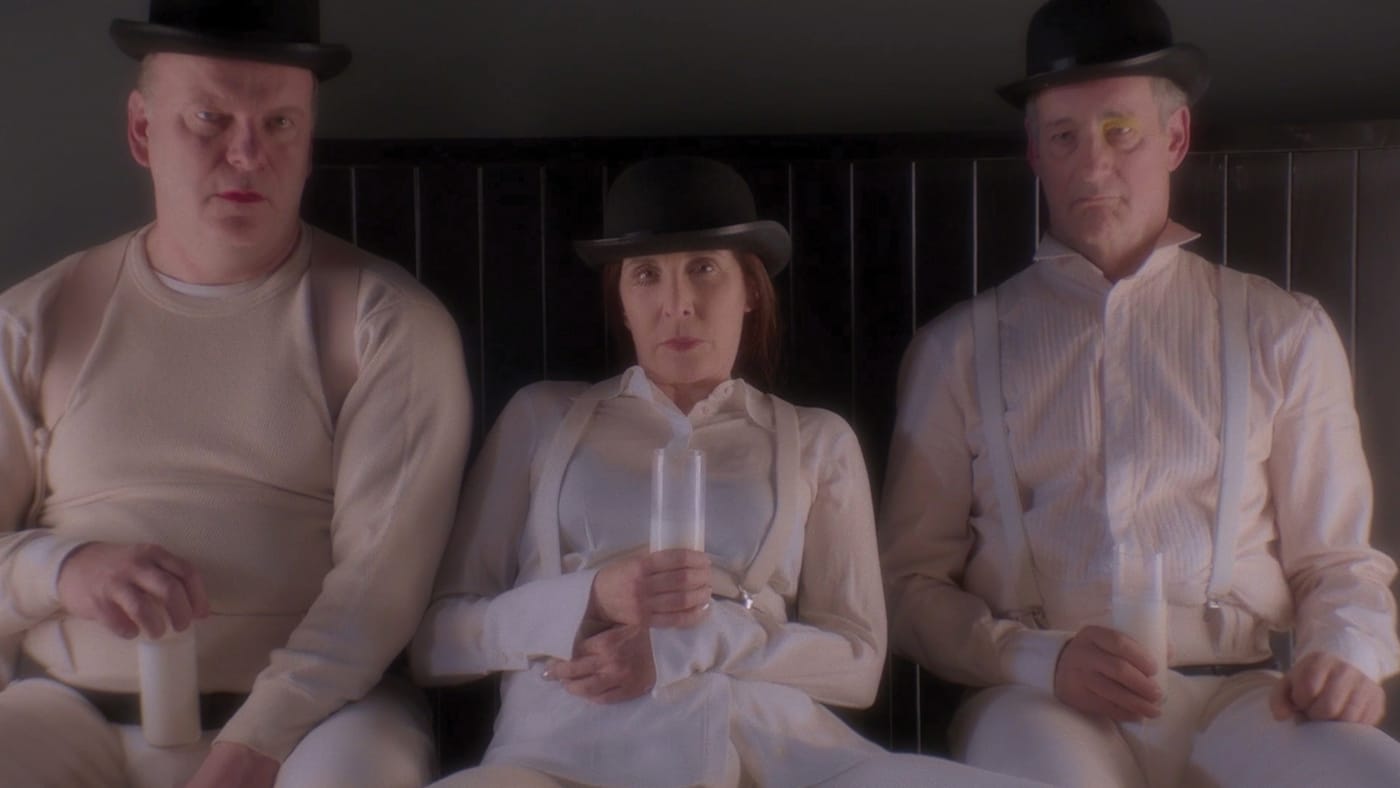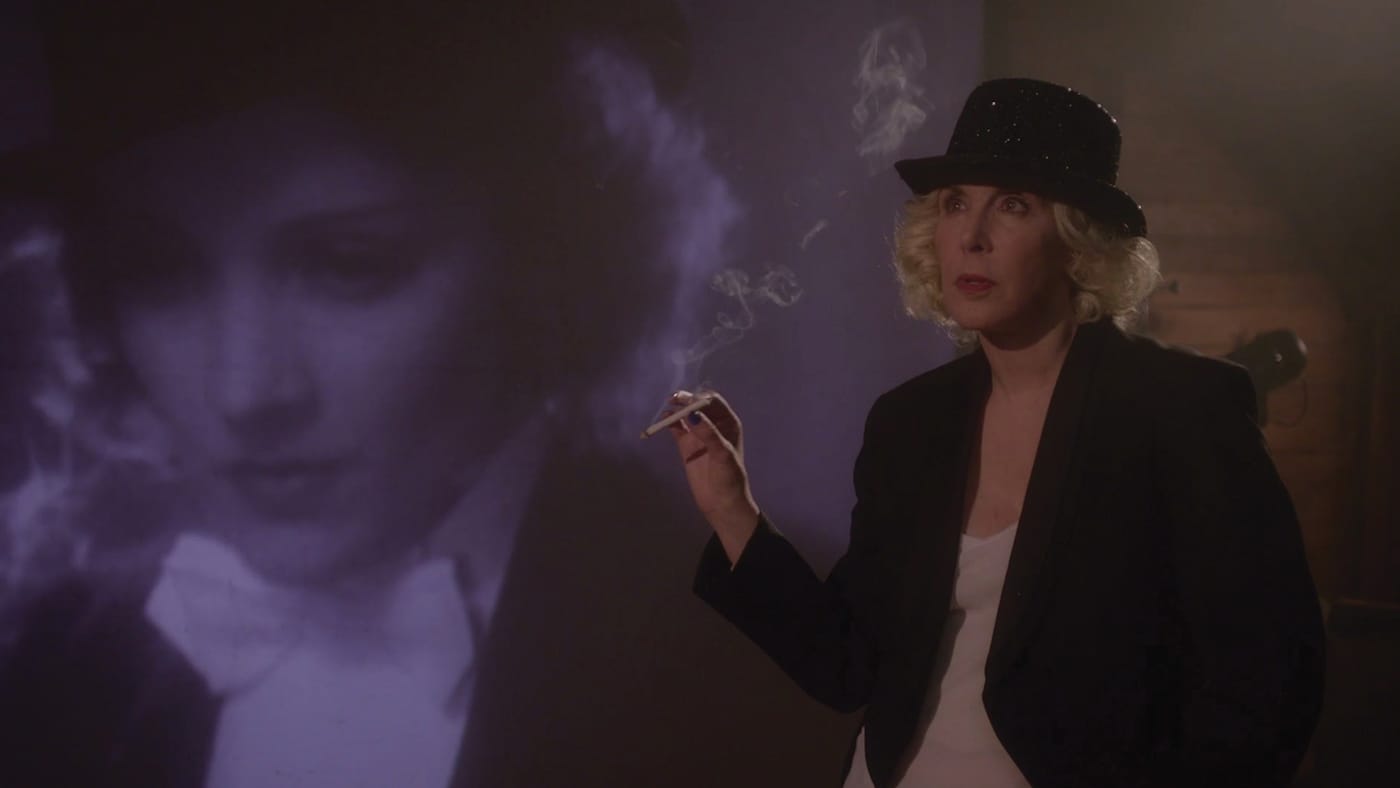 Notably, Shine’s work only really begins to take shape as she establishes new friendships in the small town. Two gardeners, out-of-work actors themselves, agree to act in her films, as does a lawyer who’s in the area. Her art, it turns out, benefits more from eager collaborators than it does from isolation. Together, they reenact scenes from old films such as The Misfits and A Clockwork Orange that relate in varying degrees to what’s going on in their lives. Throughout the scenes, Shine dons wigs and costumes to personify such stars as Marilyn Monroe and Marlene Dietrich. The videos allude to Cindy Sherman’s film stills and predilection for disguise. “I hate when other people give me ideas. It feels like art school,” Shine tells Mickey after the latter suggests, “you should embarrass yourself more.” Yet, Shine seems to have taken this advice, or at least agreed to take new risks in positioning herself in front of the camera. One might say the same of Simmons, for whom this film represents an entirely new direction — she’s never made a feature film before.