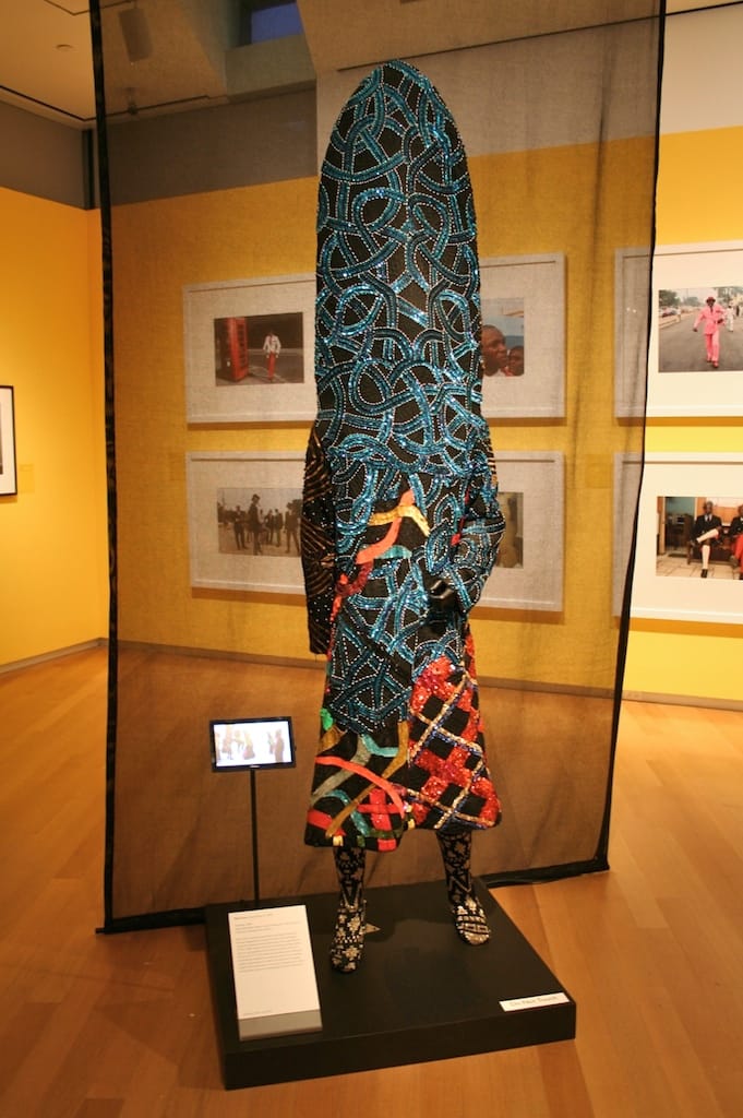 This approach not only enables interesting connections to be drawn between diverse forms of production, but also highlights the often tenuous boundaries between media: how should we classify a work like “Change” (2010), a collaboration between New York-based artist Algernon Miller and Ugandan jewelry designer Sanaa Gateja, fabricated by the Kwetu Afrika Women’s Association Angels, a women’s collective in Uganda? An intricate tapestry created out of paper beads made from recycled Obama campaign materials, the project is both a conceptual exercise and an example of a traditional craft practice adapted to incorporate modern materials. Similarly, Nick Cave’s Soundsuits, one of which is on view in the exhibition, are conceived as “wearable sculptures” inspired by African ceremonial costumes and masks. Made primarily from found objects, they not only function as ornate costumes for live dance and musical performances (the display also includes a video of the artist performing in the suit) but also as sculptural assemblages.