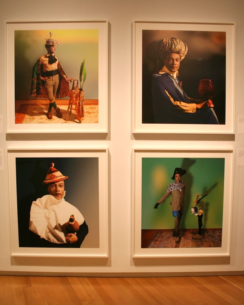 The integration of art and design not only serves to elevate functional works to the level of fine art, but also to force us to rethink the way we conceive of either category. The exhibition allows us to see Cave’s Soundsuits in conjunction with other examples of costume design, like that of Victor Harris — also known as the Big Chief of the Fi Yi Yi Mardi Gras Indian Tribe — but also with Iké Udé’s photographic self-portraits from the series Sartorial Anarchy, a highlight of the exhibition in which the artist draws upon the figure of the dandy by styling himself in flamboyant ensembles that combine pieces from different cultures and time periods: in “Sartorial Anarchy: Untitled #4” (2010), a straw boater hat festooned with flowers is worn with a boy scout shirt, tweed breeches, and Italian football socks. “Sartorial Anarchy: Untitled #2” depicts the artist in an Ottoman-style turban made from West African fabric, a dramatic hooded cape, and a contemporary button-down shirt. Each of these works explores the inherently performative nature of dress and the possibilities of costume, a point of comparison that transcends the confines of medium. Similarly, an understanding of Udé’s photographs is enriched by considering them along with Sheila Bridges’s “Harlem Toile de Jouy” wallpaper and fabric, a re-envisioning of traditional 18th-century French toile patterns with the pastoral scenes and white figures replaced with African-American stereotypes, such as figures playing basketball or wielding boom-boxes.