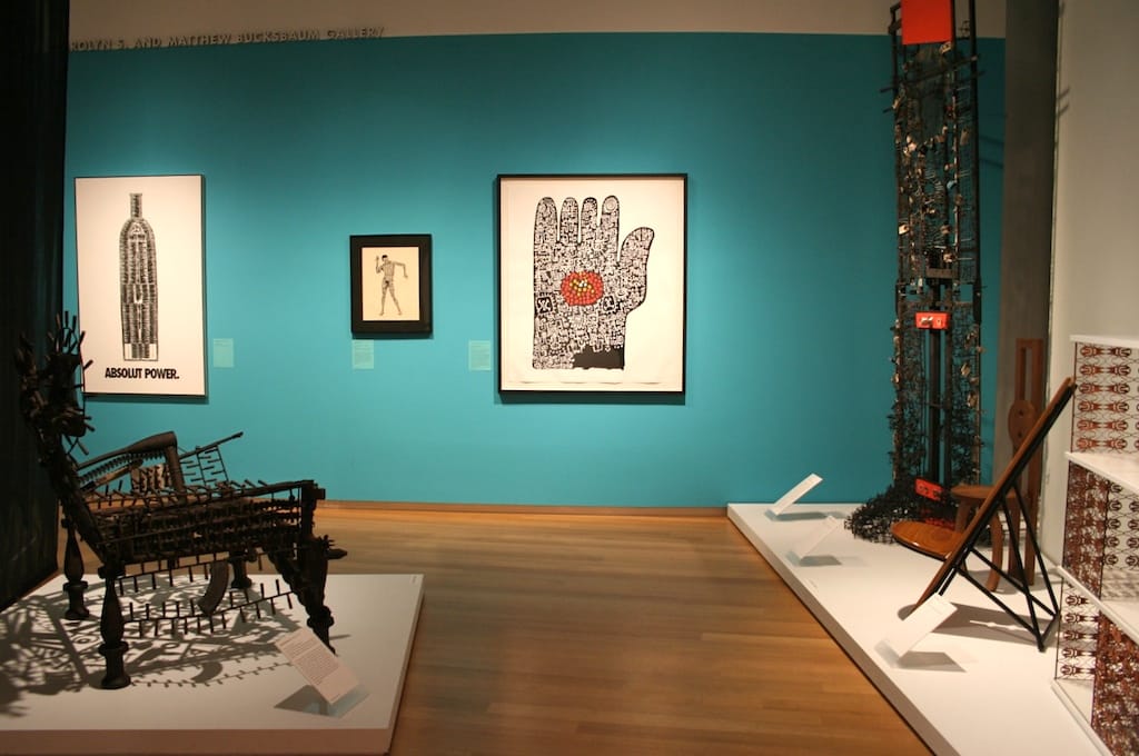 Another notable consequence of including design and functional objects alongside art is that it allows, perhaps insists upon, a discussion about the role these works play within the global economic system, one that is rarely aired publicly within museums. As the curators have stated, part of the impetus for the exhibition was a desire to explore and address the ways in which art, design, and craft have played a role in economic development, particularly on the local level. The exhibition features a number of socially-engaged projects that actively attempt to use art and design as a means of revitalizing communities: Tyree Guyton’s “The Heidelberg Project,” in which the artist and his family, along with local children, converted abandoned houses in their crime-ridden Detroit neighborhood into an enormous art installation, transforming a blighted community into one of the city’s most successful tourist attractions, is included in the exhibition, as is a selection of woven baskets by the Gahaya Links Weaving Association in Rwanda, a company that employs rural Rwandan women to create baskets that are exported to the United States and Europe. The project gives these women a means to support themselves financially while simultaneously preserving a local tradition.