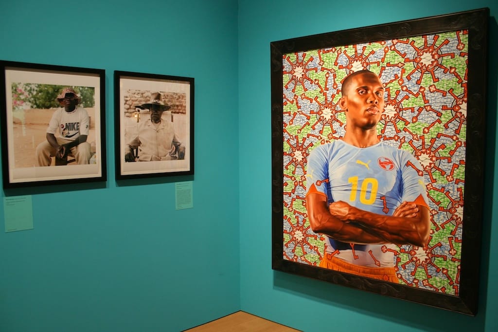 The curators occasionally point to political themes, particularly the exploitation of African people and resources by large corporations in works such as Hank Willis Thomas’s altered photograph “Scarred Chest” (2003), a black male torso covered with scars in the shape of the Nike “swoosh” logo and Yinka Shonibare MBE’s “Black Gold Toy Painting 6” (2006), which addresses the legacy of colonialism and its contemporary analogue, the multinational corporations that profit from African resources such as oil despite the overwhelming poverty of the surrounding population. However, the exhibition also includes a BMW “Art Car” decorated using a traditional Ndebele wall-painting technique by South African artist Esther Mahlangu from 1991 and a collection of soccer gear designed by Kehinde Wiley for Puma to celebrate the 2010 World Cup, the first to be hosted by an African country, accompanied by a Puma-commissioned portrait of Cameroonian soccer star Samuel Eto’o.