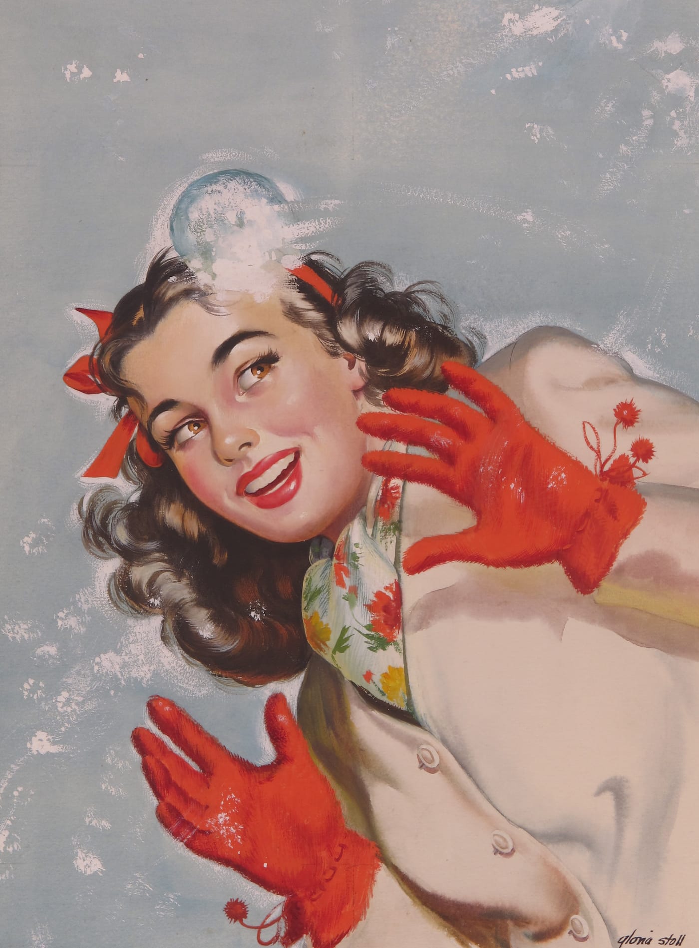 Gloria Stoll Karn’s start as a pulp fiction artist reads like one of the genre’s sensational stories. Following her father’s sudden death, she abandoned her dreams of being an artist and took a clerk job at a New York insurance company to help support her family. Soon after she bundled up all her art, and took it to her Queens building’s incinerator. However, the pile of sketches was too big to fit in the chute, so she placed it by the door with her neighbors’ discarded newspapers.