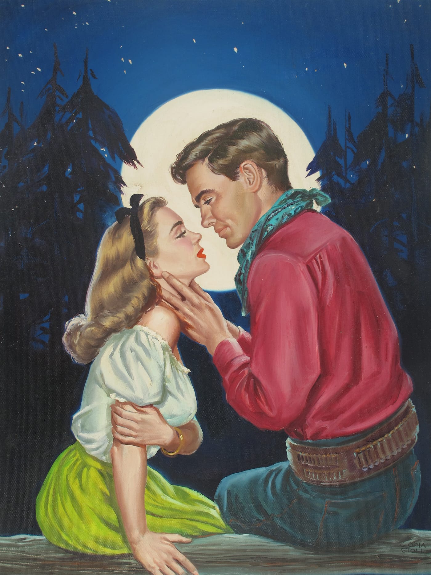 Born in New York City, Stoll Karn studied at the High School of Music & Art (now part of the Fiorello H. LaGuardia High School), and she demonstrated skills early on for portraying people using realism, with a playful streak. She went on to attend classes at the Art Students League of New York, and life model classes at the Society of Illustrators. An 1947 illustration has a couple passionately kissing in the kitchen as smoke billows out of a toaster, another from 1949 has a woman dangling a candy kiss in one hand while she slyly looks back at a flirtatious cowboy. Whereas most artists worked in one area of pulp, whether crime or romance, she was active across genres. At the same time she was painting wholesome cowboys wooing women with curled hair for Rangeland Romances, she was imagining gun-toting detectives and girl Fridays for New Detective, and otherworldly scenes of cat-eyed femme fatales and a skeletal hand displaying a royal flush, each card with a woman’s face transforming into a skull, for Dime Mystery.