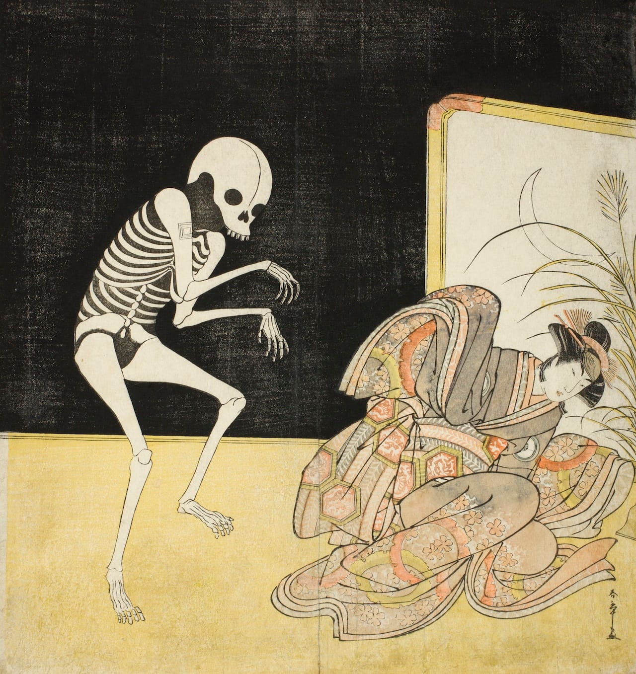 Katsukawa Shunsho’s 1773 print depicts Matsukaze, one of two sisters who tragically fall for the same man, who jilts them both. The heartbroken Matsukaze later sees her lover’s face in a pine tree.
