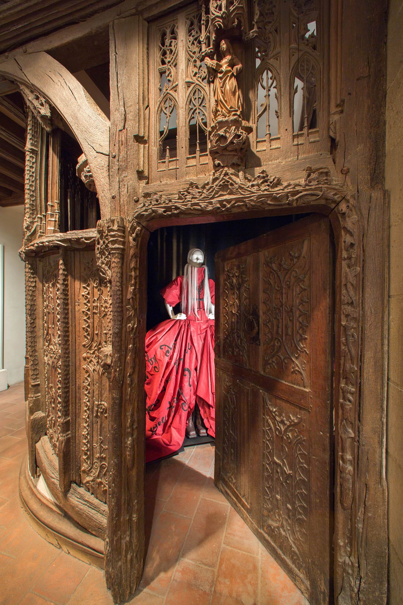 Nevertheless, the show succeeds in showcasing the tension between high fashion and high religion at the Cloisters more so than the main building. Ghostly apparitions float above the ground of an atrium, a blood-red Christian Dior gown peeks behind a wood-carved door, and a Gaultier stained-glass dress catches the light through a stained-glass window. Perhaps because of the intimate space, these displays spark a more intriguing narrative between the old and the new.