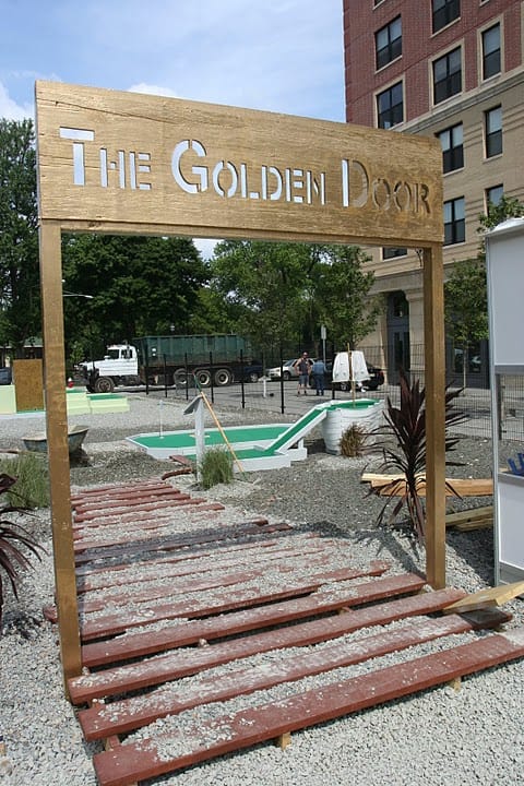 The Golden Door is the anachronistic nickname of Jersey City, which acquired the moniker at the turn of the 20th century when it was a magnet for newly arrived Ellis Island immigrants. Today, “Golden Door” is the name of a new temporary mini-golf course-cum-art exhibition at Hamilton Square in downtown Jersey City organized by the Jersey City Museum as an innovative new summer fundraising venture.