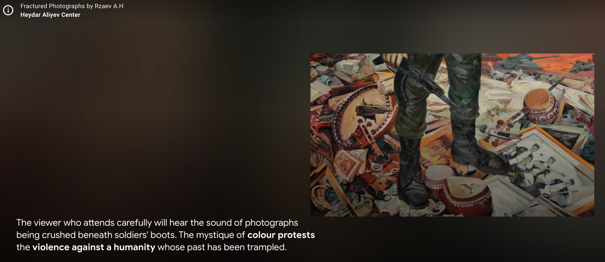 The only significant support of this destructive mythology outside of Azerbaijan is found on Google Arts & Culture's site, on its "Virtual Karabakh" page. This resource was made by "The Virtual Karabakh' Information - Communication Technology Centre … by decree of President Ilham Aliyev of the Republic of Azerbaijan." On it, one finds page after page of artifacts from Nagorno Karabakh, which are a strange mishmash of sentimentality ("The woman is a symbol of beauty, elegance and innocence. The woman in this painting represent loyalty. They remember loved ones lost at the frontline [e.g. killed by Armenians]"). This schmaltz is accompanied by a painting of presumably Armenian soldiers smashing Azeri cultural artifacts, and innocuous pictures of Azeri costumes and rugs from the 19th century. However, propaganda about the Caucasian Albanian heritage of the region constitutes the bulk of the site. Most of these are in the section titled "The Albanian-Christian Architecture of Karabakh," which, in picture after picture of Armenian monasteries, churches, and other ruins, the site expounds how they are absolutely not Armenian. There have been no Armenians in the area, according to this site, except as recent aggressors. It should be mentioned that Caucasian Albanians have no connection to current day Albania.