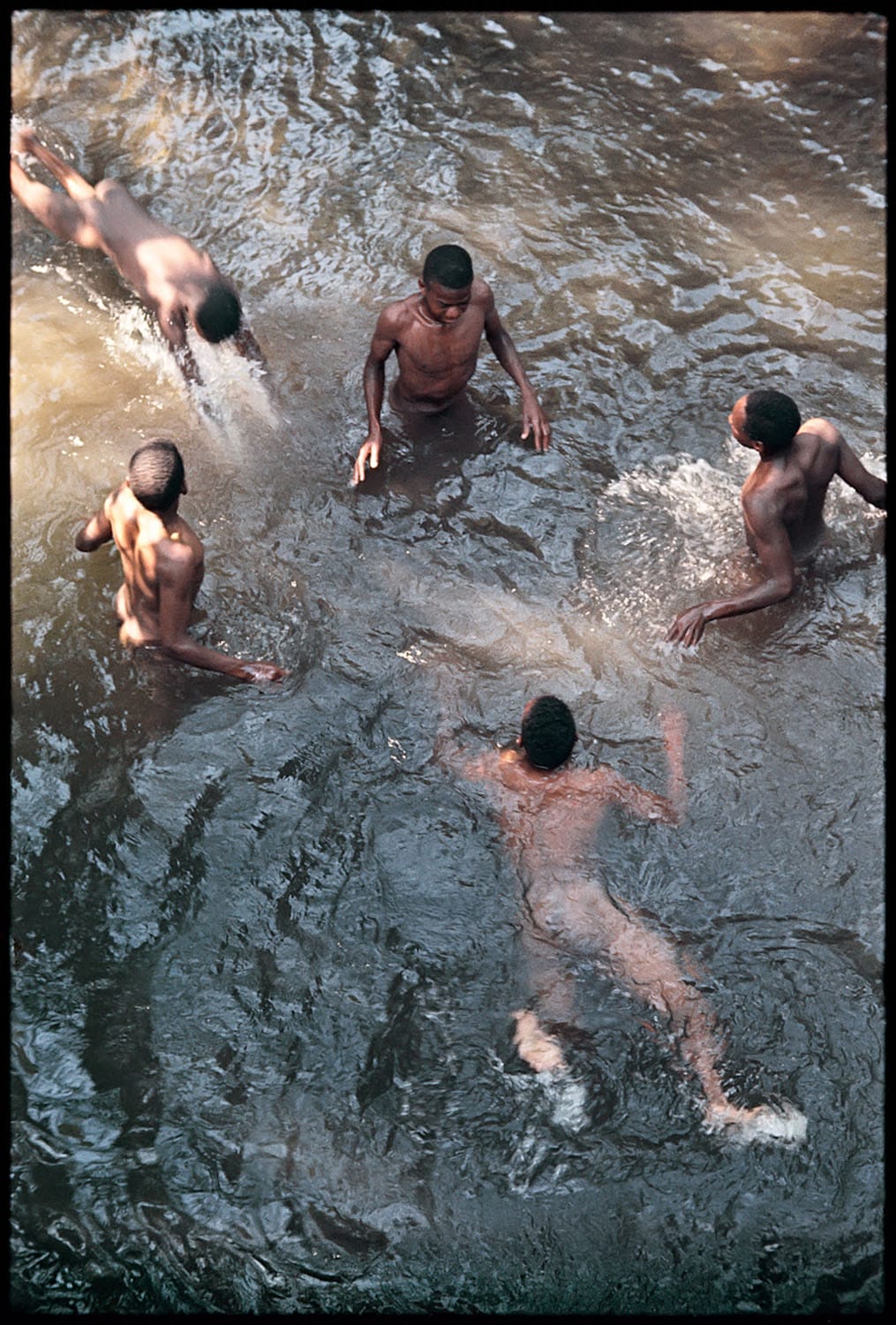 At the 20th Street location, one eminent photograph is “Department Store, Mobile, Alabama” (1956), in which an elegantly dressed woman and young girl stand underneath a “colored entrance” sign, indicating the segregated terrain of the city in the era of Jim Crow. Parks photographed women and children conducting other quotidian tasks such as drinking from a “colored” water fountain, gazing across the fence at public parks they could not access, and window shopping amid white mannequins. In these visual narratives of Black people traversing unequal public spaces, the scene is set for the major political upheavals that would come. A 1947 photograph of a doll test being administered to a Black child foreshadows the 1954 Brown V. Board of Education Supreme Court decision, which would rule segregation in public schools unconstitutional. “Watering Hole, Fort Scott, Kansas” (1963) and “Untitled, Harlem, New York” (1948) portray Black people taking pleasure in water — swimming in a lake and cooling off with an open fire hydrant — offering joyful alternatives to prevalent images of segregated drinking fountains and police use of water hoses as a weapon against Civil Rights protestors.