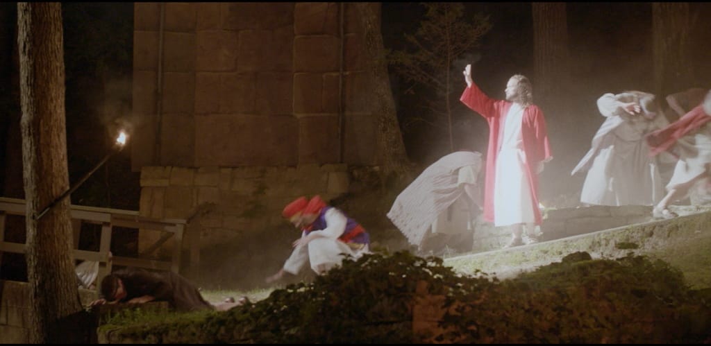 Michael Palmieri and Donal Mosher’s The Gospel of Eureka takes an incredibly different approach, both formally and narratively. It keeps its focus directly on Eureka Springs, Arkansas. This is a place famous for its religious symbols: Christ of the Ozarks, which is the largest statue of Jesus in North America, as well as The Great Passion Play, which has run every summer for many years. The town also has a small but thriving LGBTQ community. Queer life here is depicted as both critiquing and riffing on the town’s Evangelical legacy, even as their own identities are tied to it. We see drag queens dressed as church ladies who lip-sync to Christian novelty songs at a gay bar. A gay pastor speaks to his congregation about how scripture has been arbitrarily used to attack the LGBTQ community, invoking other scripture which contradicts their assertions. The town’s tourist traps were the projects of the fascist organizer Gerald L.K. Smith, but we’re shown how it can evolve.