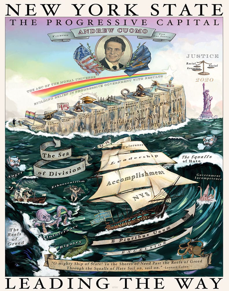 A strange allegorical representation of New York State in 2020 designed by Governor Andrew Cuomo is about as “with the times” as a parchment scroll. The poster, presented during a private reception on Wednesday night following the governor’s annual State of the State address, is subtitled “The Progressive Capital” and depicts a morally righteous vessel with sails of “leadership,” “tolerance,” and “accomplishment” navigating a storm-roiled “Sea of Division.” In its turbulent journey, the ship must also contend with a cast of nefarious characters, including an octopus called Intolerance who, like his namesake, has not aged well; a tiny pink squid embodying “Government Incompetence”; and what looks to be a huffing sea monster simply labeled “Anger.”