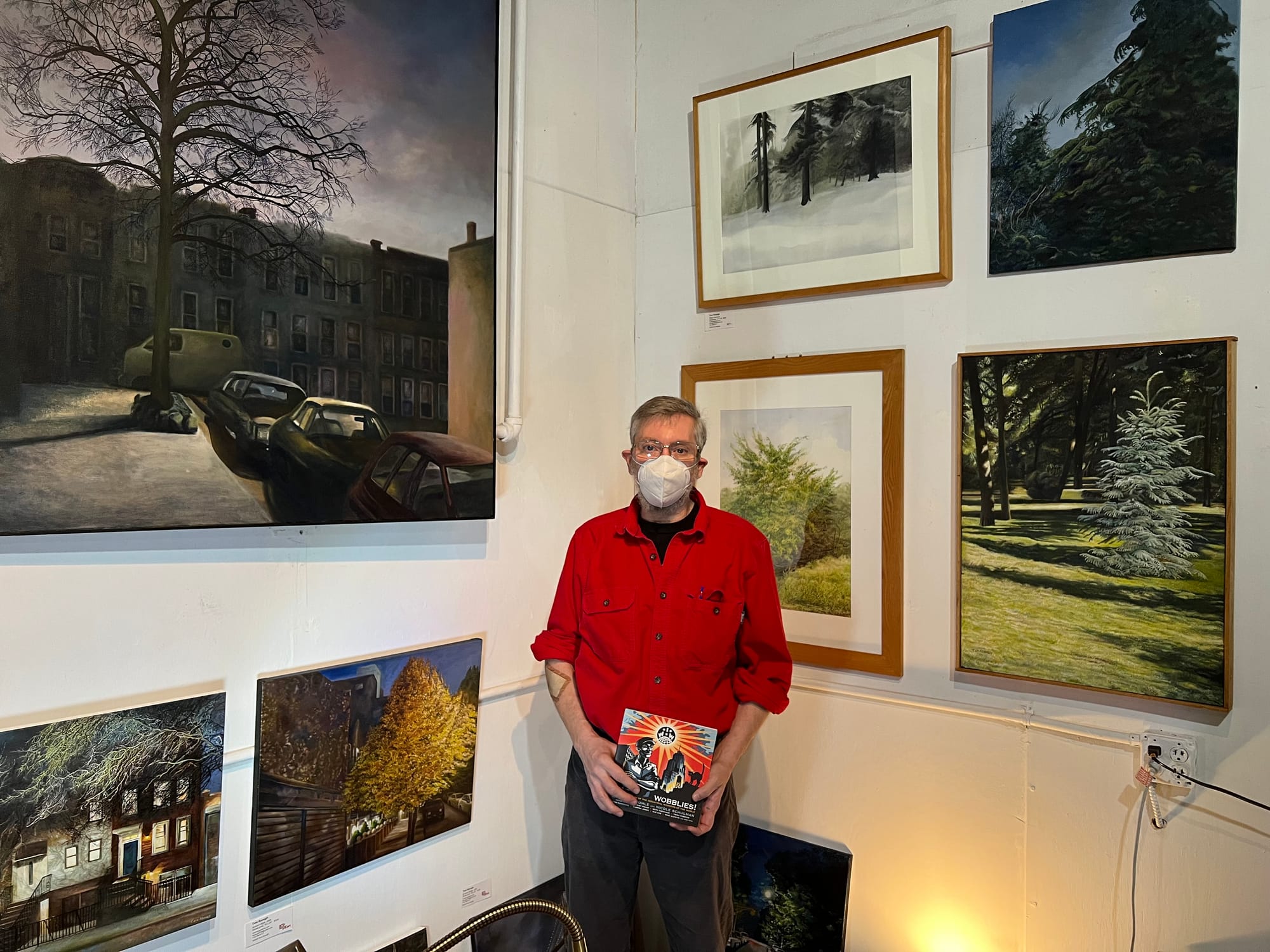 Across the room, Tom Keough placed his large-scale cityscape paintings above smaller boxes of magazines featuring his leftist comics. A lifelong illustrator who works part-time at a homeless shelter, Keough recalls the influence of real estate during his studies at Pratt in the 1980s.