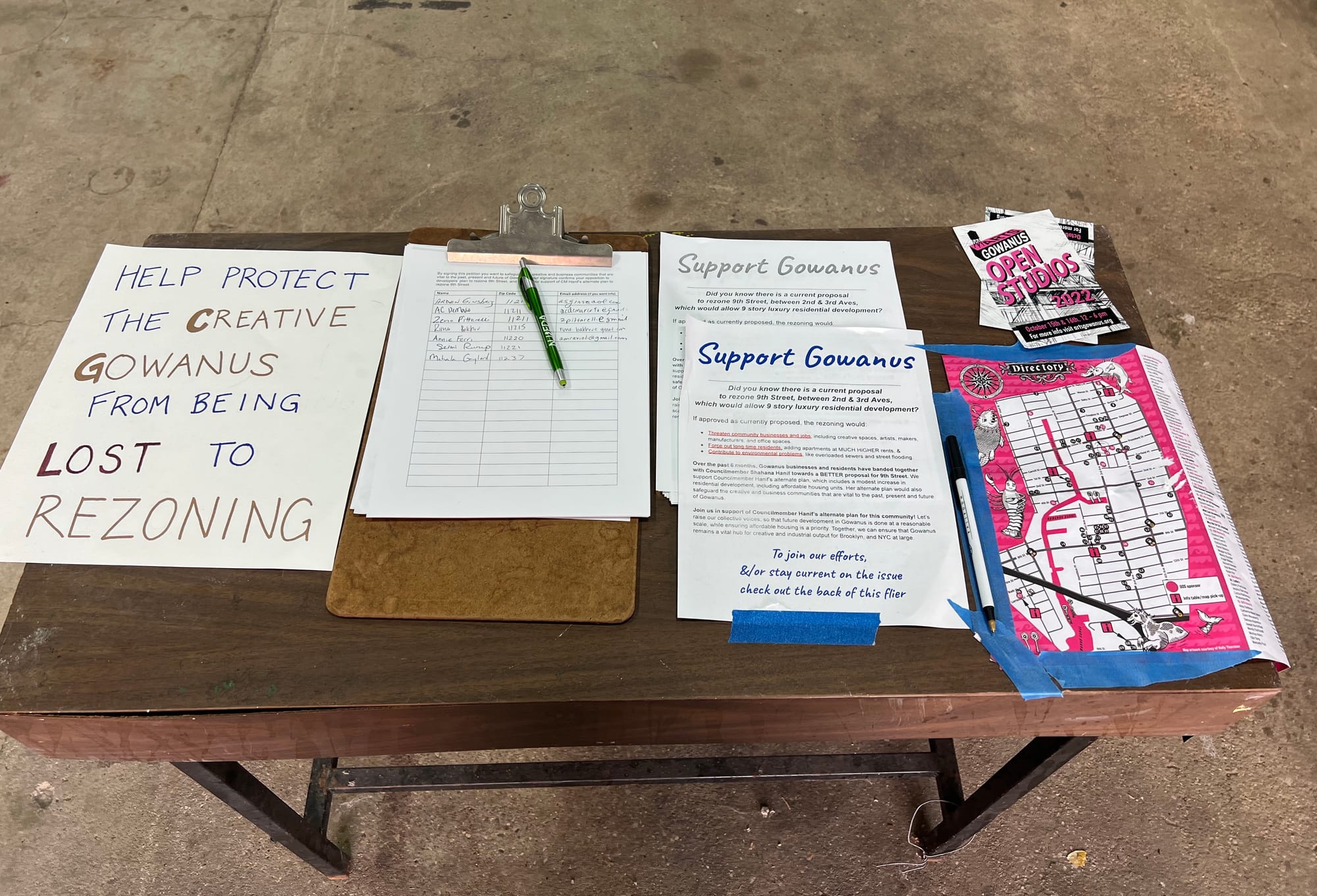 Larger environmental issues with the Department of City Planning's recent Gowanus Industrial Business Zone (IBZ) Vision Plan, which maps out guidelines for future development, are leading community members to make similar connections. At the 8th Street Art Garage, a table with flyers and a petition asks visitors to oppose rezoning. Beth Morrow, who owns the Garage, claims that luxury developers have exacerbated flooding and sewage in the area, all while buying up nearby studio buildings and leaving them empty. She and her neighbors are now working with local organizations Gowanus Alliance and Voice of Gowanus and Council Member Shahana Hanif to see what can be done.