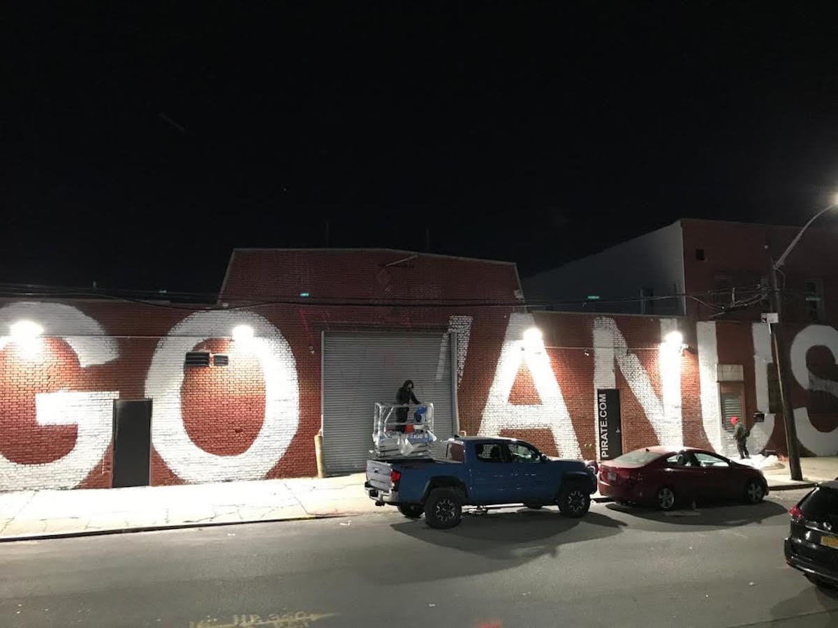 The mural is literally just the name Gowanus painted in white sans-serif across Pirate Studios's red brick wall. Innocent enough, right? Several passersby would agree with you, too. Except there's one outstanding coincidence — the "W" in Gowanus is painted on a garage door. And should that door ever open, the building would loudly proclaim "GO ANUS."