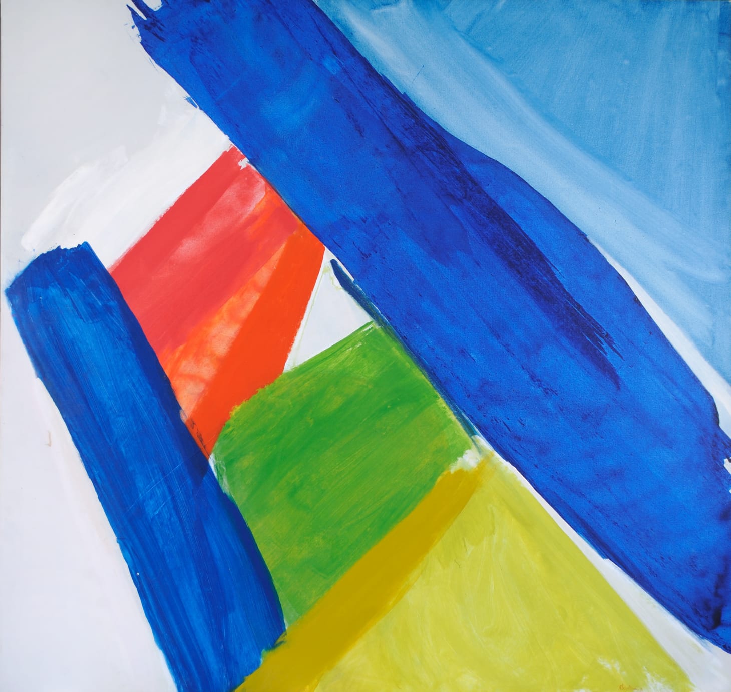 Herzbrun avoided association with the male-dominated Washington Color School, which she viewed as rigid and emotionless. Her freeform style became progressively geometric through the ‘60s and ‘70s. Hazy landscapes cleared into groups of small and defined figures, as in “Like Thunder” and “Storm Altered (Colorado Series)” (1965). Separate tracts of paint assume bolder colors that play off each other haphazardly. In “Aeroplat” (1970), stacked streaks of blue, red, green and yellow cut diagonally like technicolor contrails. Part of her “Color Sweeps” series, the painting muses on the theme of flight through a mixture of heavy brushing and staining, with bright tones producing a sharp and euphoric air.