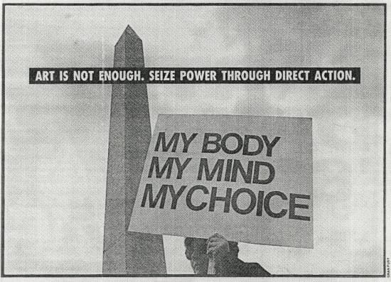 MM: This was a very small piece that was in the Village Voice. It was one we had done a number of pieces around this time saying “Art is not enough.” We spent years and years saying, “We’ll never exhibit in an art gallery. We aren’t doing that.”
