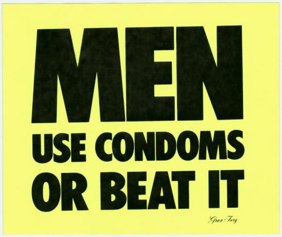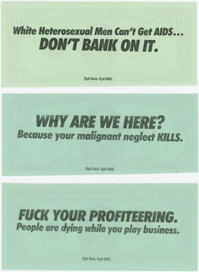 Beginning in tandem with ACT-UP during the mid-1980s, Gran Fury, whose name came from the NYPD’s unmarked Plymouth cars, provided the artistic thrust to the AIDS activist movements during a time when AIDS was barely mentioned by the media or the president. Taking tips from the Situationists, Gran Fury combined the techniques of advertising with information and outrage over the AIDS crisis to educate and motivate the general public with slogans such as “Women Don’t Get AIDS” and “Kissing Doesn’t Kill”.