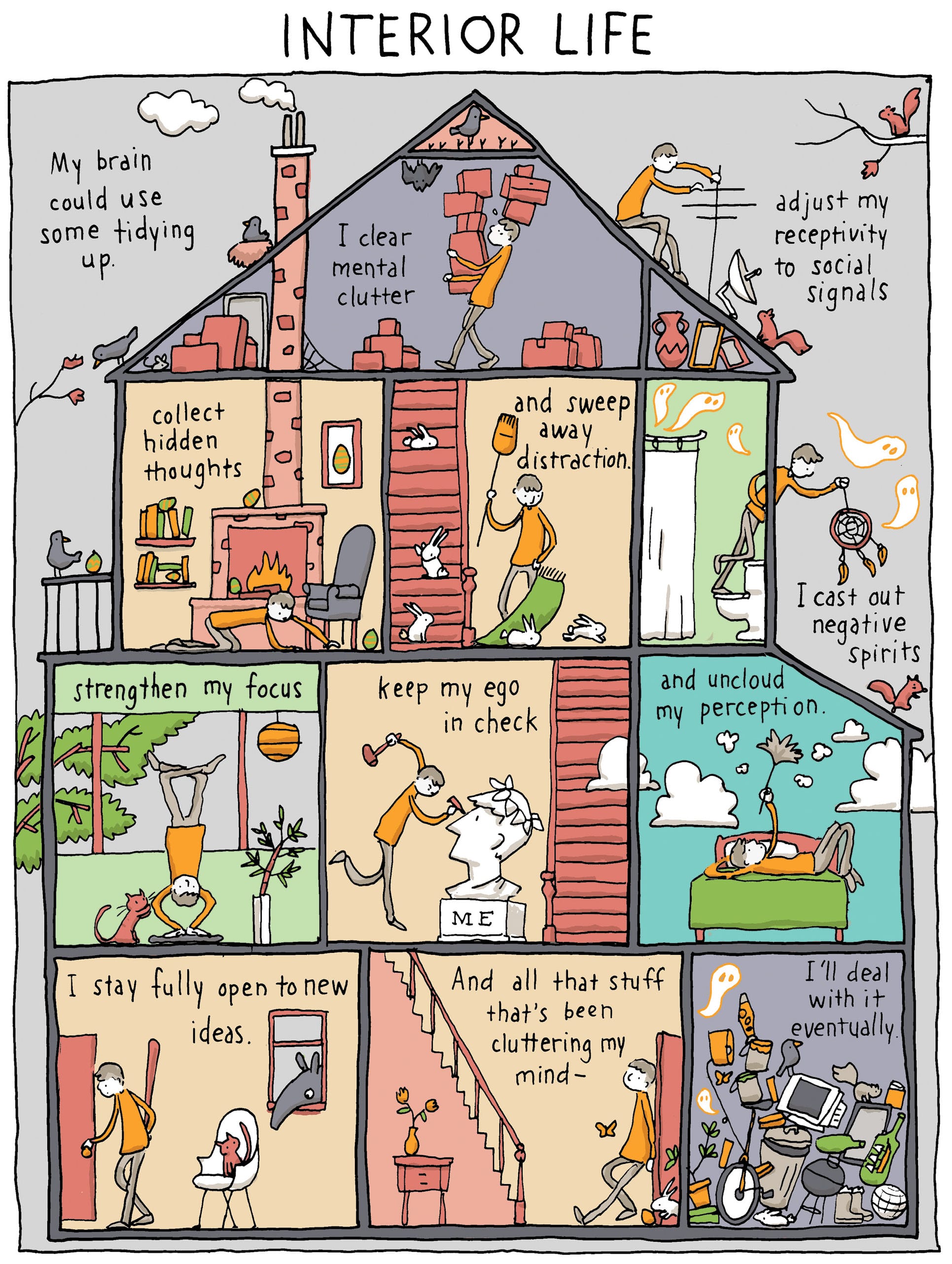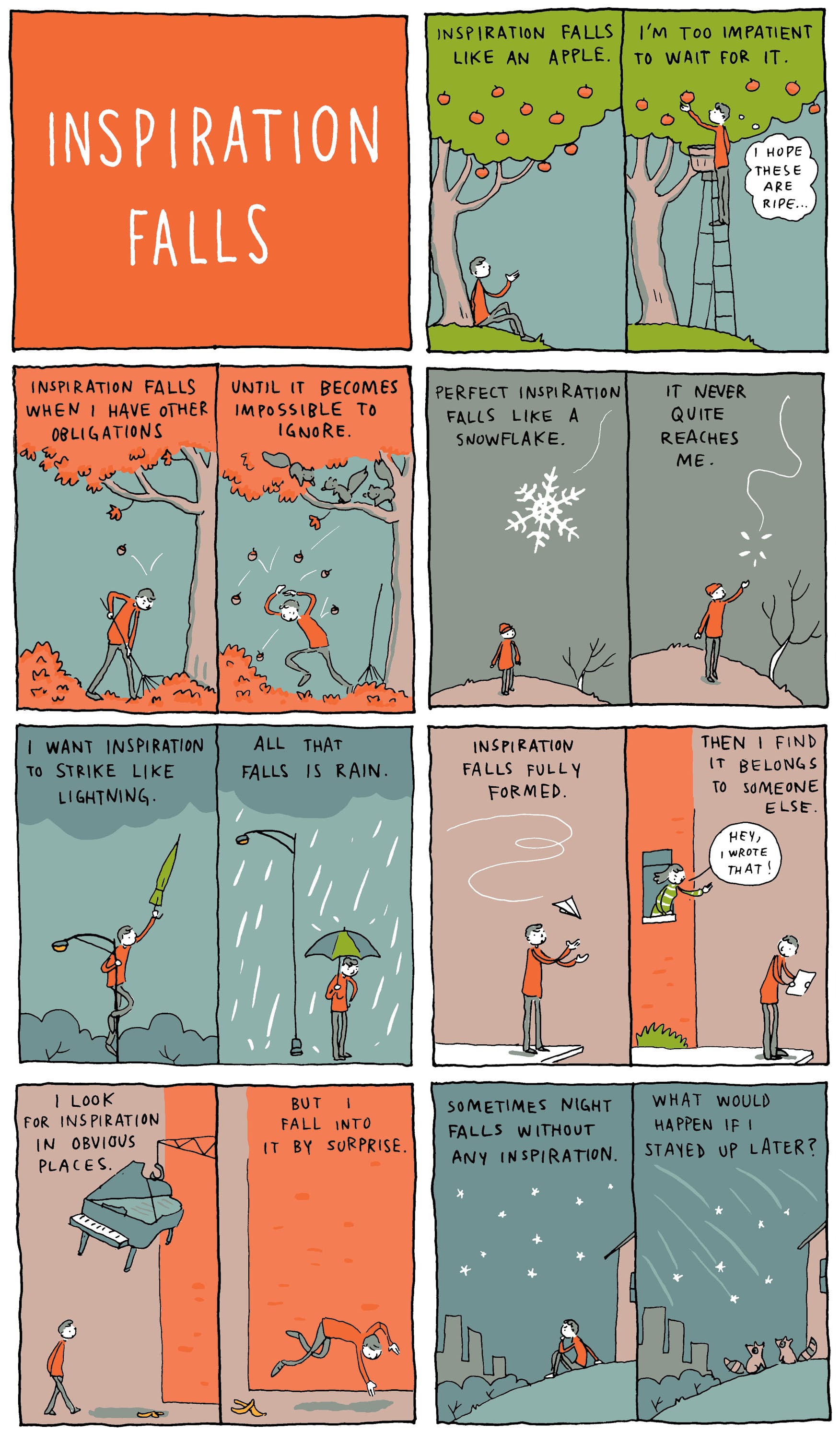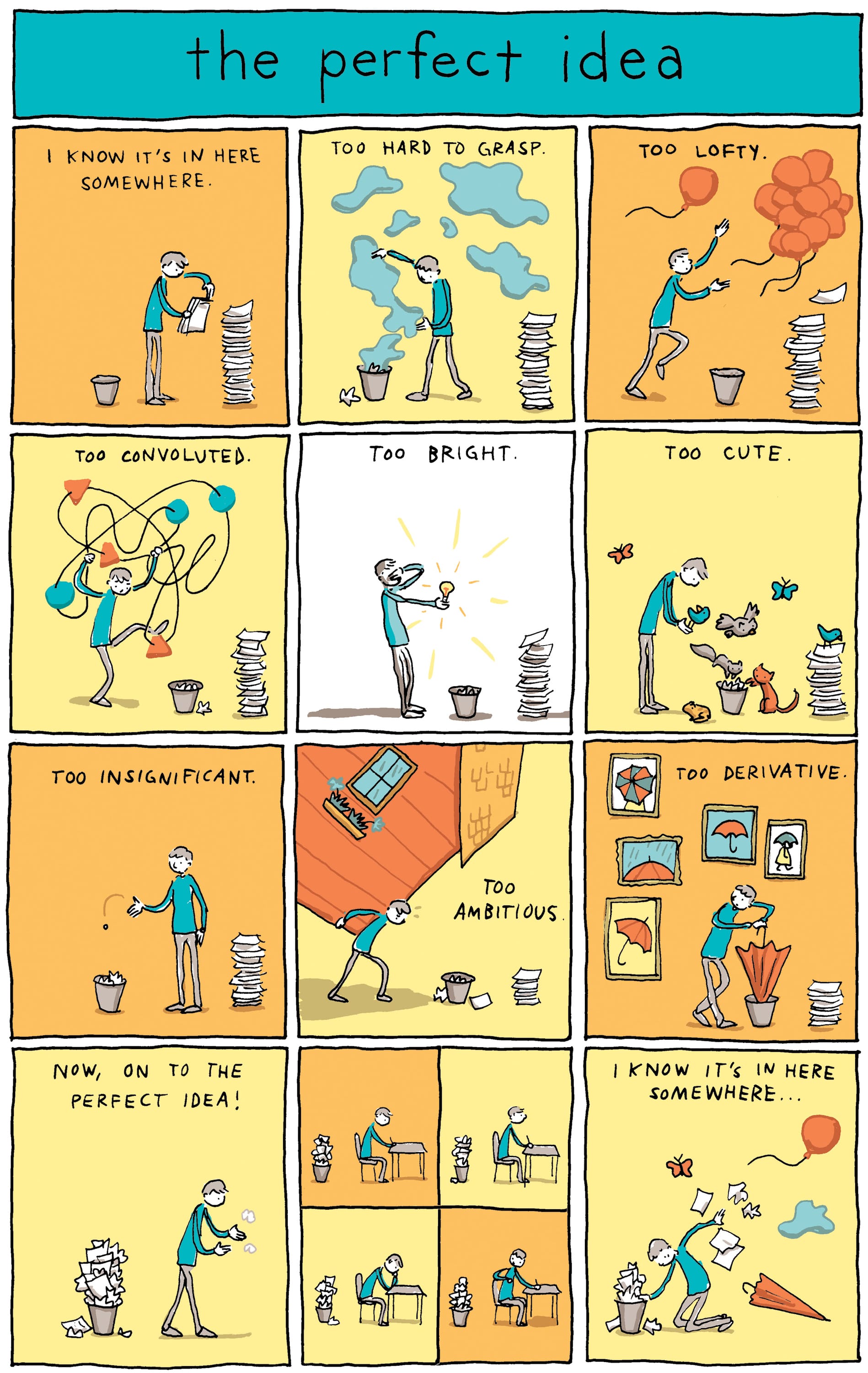Flipping through The Shape of Ideas, I couldn’t help but imagine Snider slumped over his desk at 7 am on a weekday before work, racking his brain over how best to visually describe an idea that’s “too insignificant,” or in which panel to place “my student loan debt” in his biggest fears — he settled on second, after “dead birds.” In his ten categories of genius, it seems Snider forgot just one — procrastination. But I suppose that one’s always implied, right?