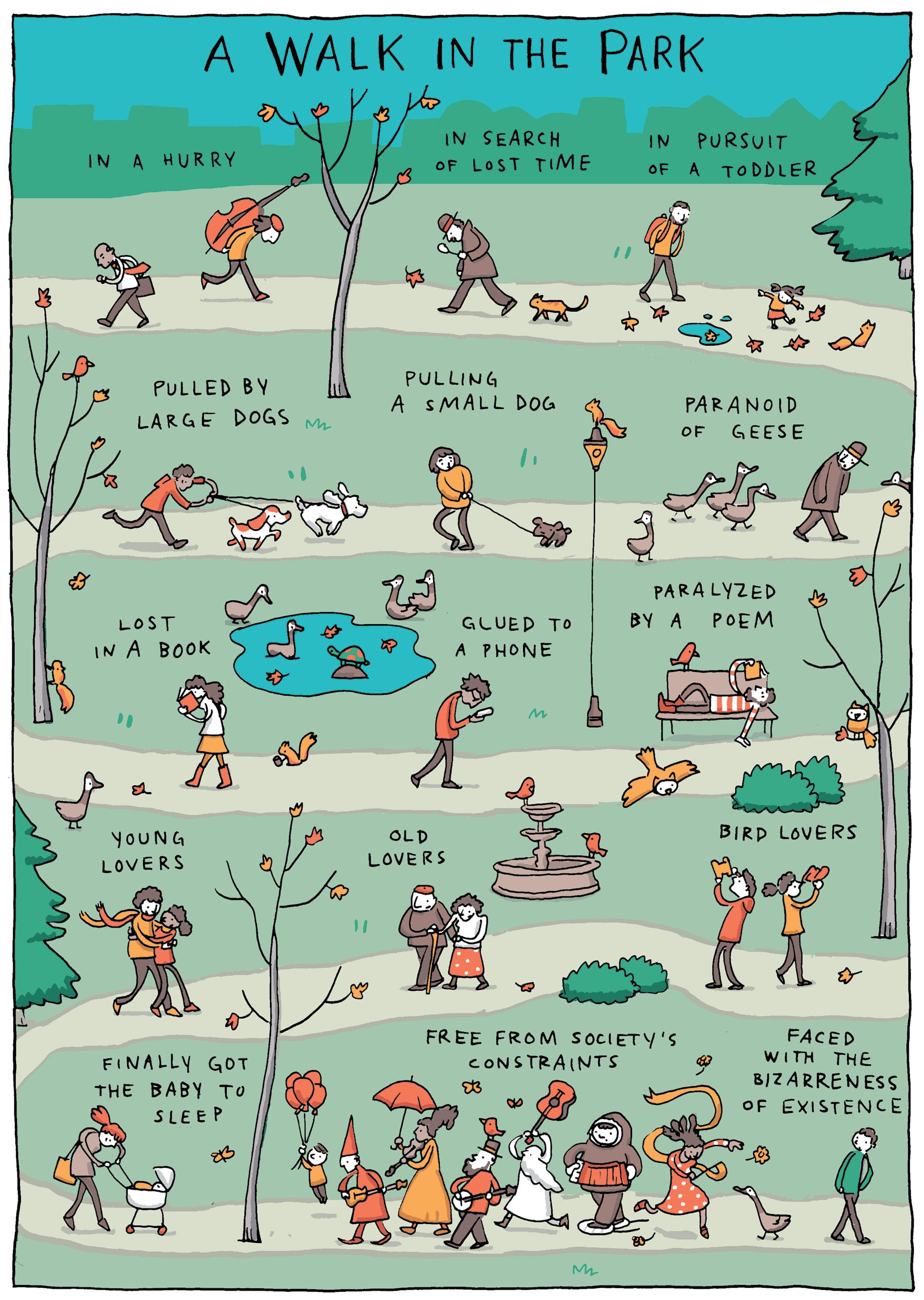 Snider often uses these kinds of metaphors, and while many of his comics are traditionally sequential, the most original consist of a single panel with snippets of story throughout that can be read in almost any order and still make sense. For example, in the “Exploration” section, a walk in the park yields a variety of characters and activities. As cartoon Snider weaves his way along the path, so does the reader’s gaze.
