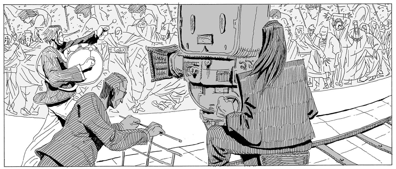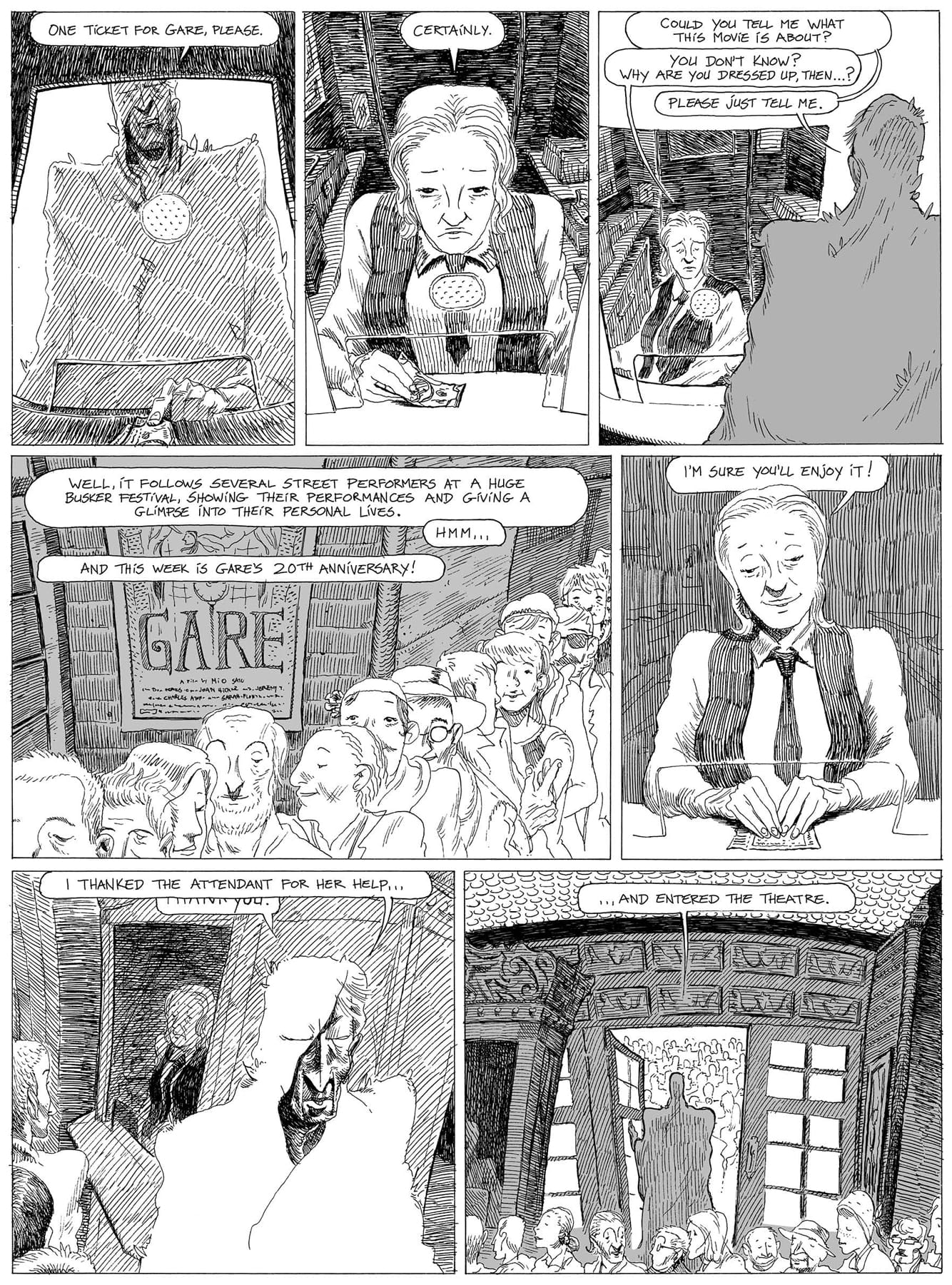 The reader soon finds that Herman is much more than just a cleaner. He’s a master of disguise, able to transform his appearance into a variety of different people and characters. He goes home after work one day, metamorphosing into a tall shadowy man in a cloak, and decides to join the long line at a movie theater for a popular film about street performers. The movie, Gare, is celebrating its 20th anniversary, and when it ends, the genius director appears onstage to the lively standing ovation of an audience dressed up for the occasion. The director declares that she’ll be holding open auditions for a new film on the waterfront. Intrigued, Herman decides to audition … as does everyone else in the theater and a large portion of the rest of the city.