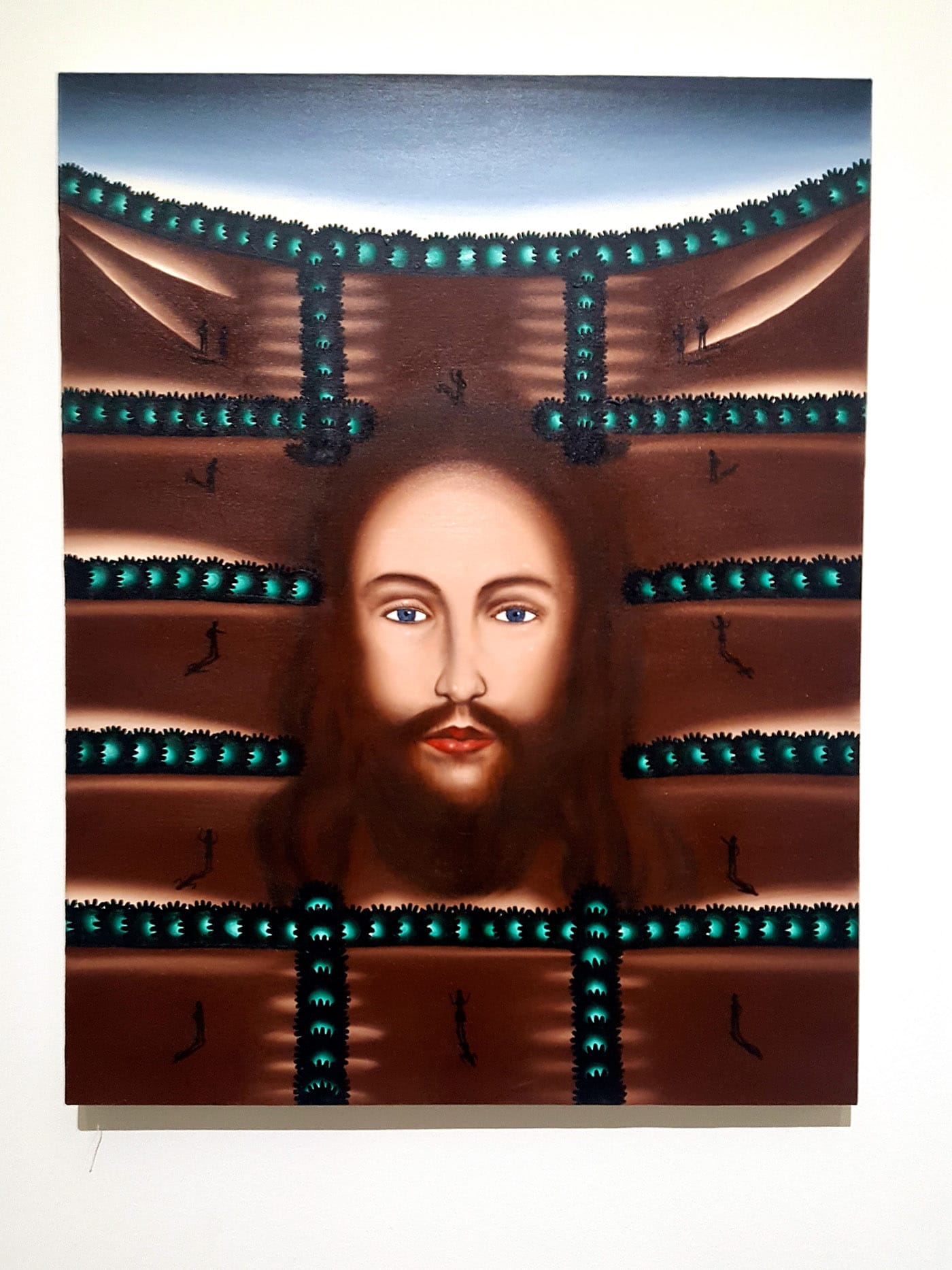Looking through his collections, one wonders if Brown used the work of outsider artists to presage his own. One of his paintings, “Veronica’s Landscape” (1988), contains the easily identifiable visage of Jesus embedded in a farm-like grid of brown and green rows; it also mirrors very closely a concave portrait, “Jesus,” made by an unknown artist in slip-cast ceramic, glaze, and paint, that’s included within Brown’s “Jesus Table” arrangement upstairs. Arguably, many portraits of Jesus bear common characteristics, but equally possible is that Brown drew inspiration from or perceived a kinship with the work of makers who were left nameless and considered outside the world of “real” artists.