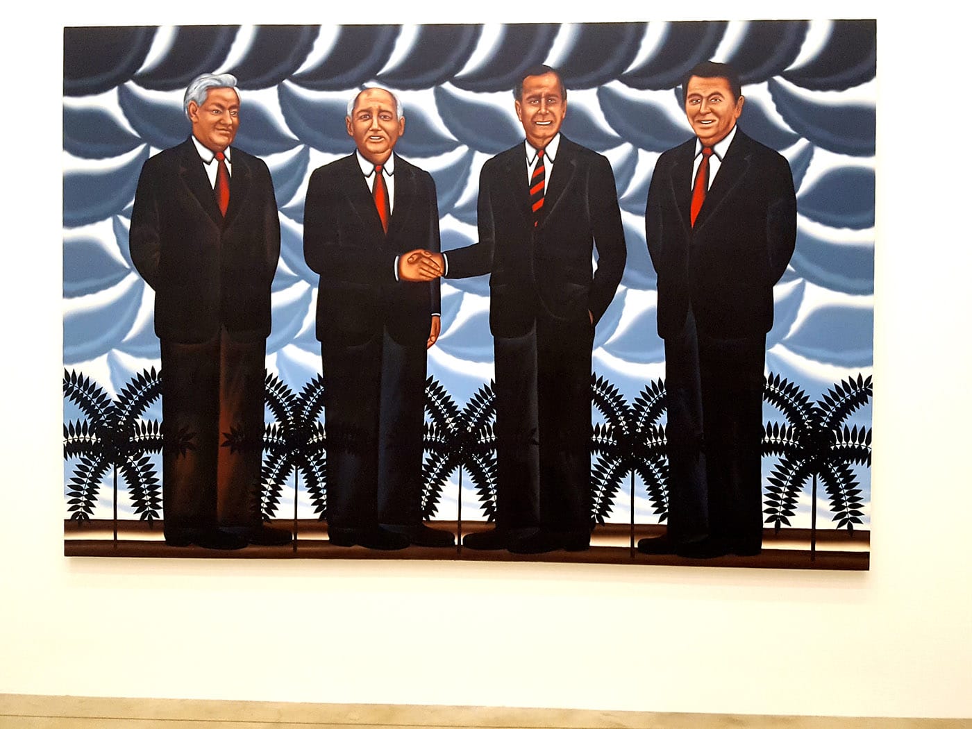 With recurring themes of political alliance and espionage, callouts of celebrity culture, and a motif of tall buildings populated by indistinct figures, Brown’s visual lexicon feels remarkably prescient of our current moment. Perhaps this is because, as a queer man living through the devastating 1980s AIDS crisis, Brown witnessed many of the failures and intentional cruelties of the systems of US governance that are only now being recognized by mainstream society. In this way, art made by artists who come from marginalized populations might be treated as a prognosticator for issues that will become central to society. It’s impossible to look at such late works by Brown as “The War We Won” (1991), with its quartet of grinning politicians, or the environmentally pointed “Landscape With Dollar Sign” (1991) and not see the hot-button issues of our era — to say nothing of the haunting echoes in his repeated images of burning or crumbling skyscrapers.