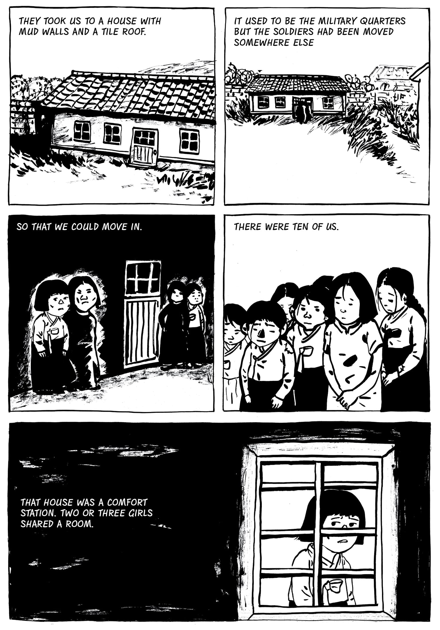 The “comfort women” were mostly Korean women victimized in a sprawling human trafficking operation conducted by the Japanese Imperial Army during World War II. The first comfort stations — sites of state-controlled sexual slavery, staffed largely by teenaged girls who were kidnapped or lured there under false pretenses — were established in the early 1930s. In the ensuing years, Japan’s program expanded considerably, and at least 50,000 women (possibly up to 200,000) were enslaved to engage in sexual servitude with soldiers across Asia. The euphemistic phrase “comfort woman” — the most prominently used term for the victims and a direct English translation of the Japanese word “ianfu,” which means “prostitute” — fails to depict the human rights violations that took place under this system of rape and exploitation. Reservations about legitimizing the phrase preface Grass, a black-and-white work of nonfiction comics by South Korean cartoonist Keum Suk Gendry-Kim, translated by Janet Hong and published by Drawn & Quarterly. It tells Lee Ok-sun’s story.