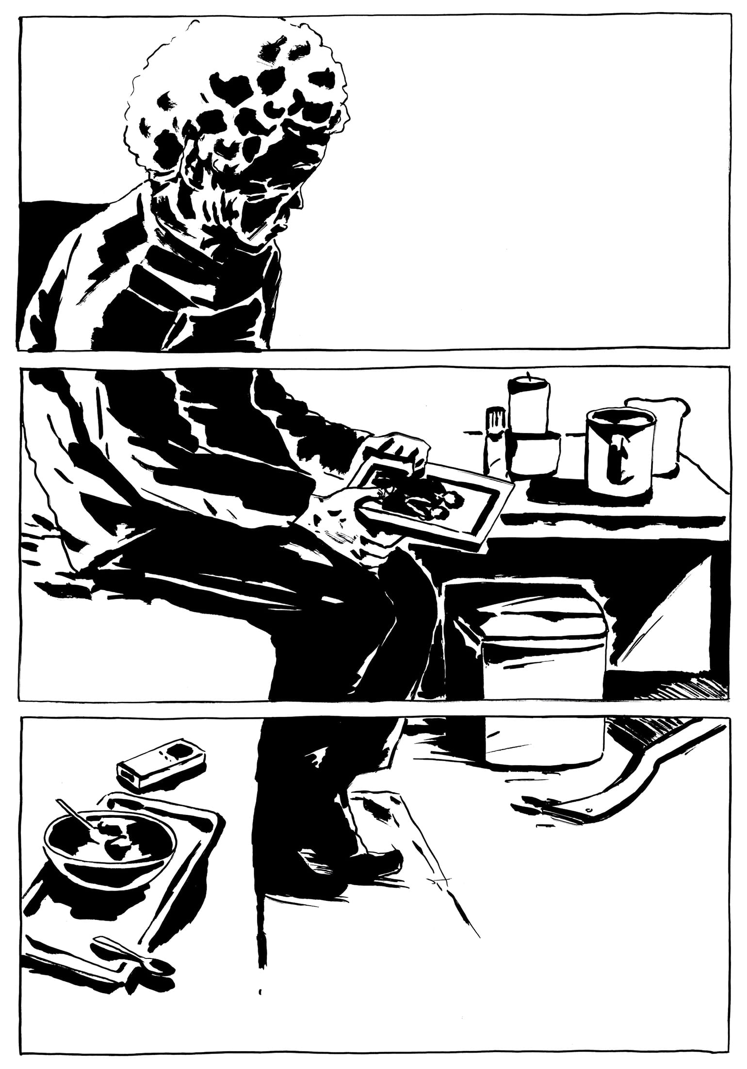 Wordless, wholly blacked-out square panels follow the first assault in Grass, which marks the halfway point in the voluminous comic. Narrative text describes the violence, but it’s comparatively mostly implied in the art, with Gendry-Kim’s heavy reliance on blotty black splotches and backlit figures taking the lead — soldiers’ faces are shrouded in shadow. Ok-sun discusses comfort women’s deaths, primitive and invasive medical procedures for deflecting or treating STDs, beatings by soldiers and police, and contracting diseases that rendered childbirth impossible for her.