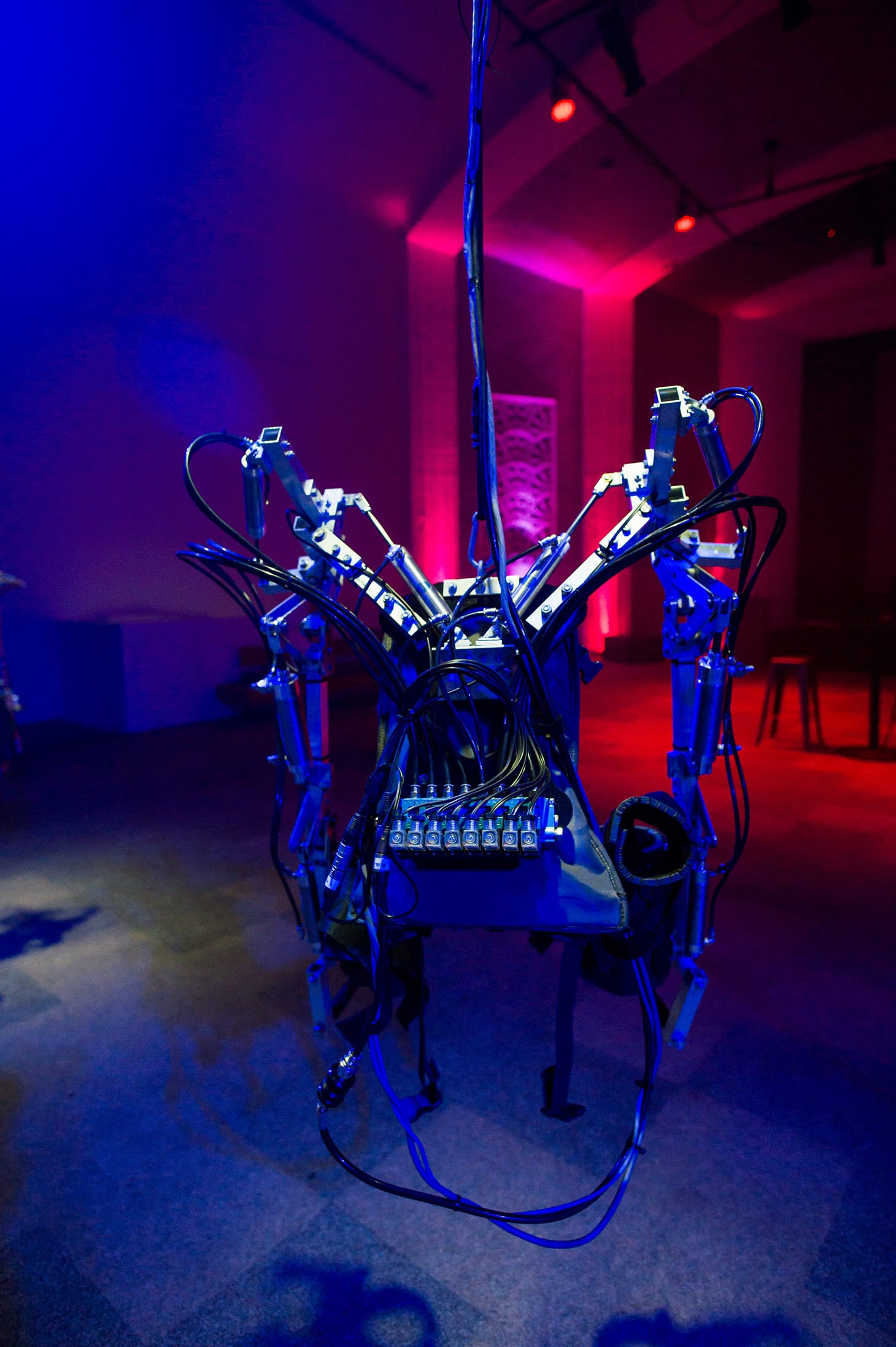 Gray Area Festival curator Barry Threw spoke about tackling one of the drawbacks of these new, spectacular experiences. While they are visually appealing and impressive technical achievements, conceptual rigor gets lost. Threw’s comments are in reference to pioneering pop-ups like the Museum of Ice Cream and the technological magic that made installations like the Rain Room possible. To show an alternative way art and technology could change how we experience art, Gray Area Festival presented two works that hint at this future: Louis-Philippe Demers and Bill Vorn’s Inferno, a performance centered around mechanical exoskeleton apparatuses that evokes themes from Dante’s Inferno, and the ISM Hexadome, a custom-built architectural audiovisual venue developed by the Institute for Sound and Music, Berlin.