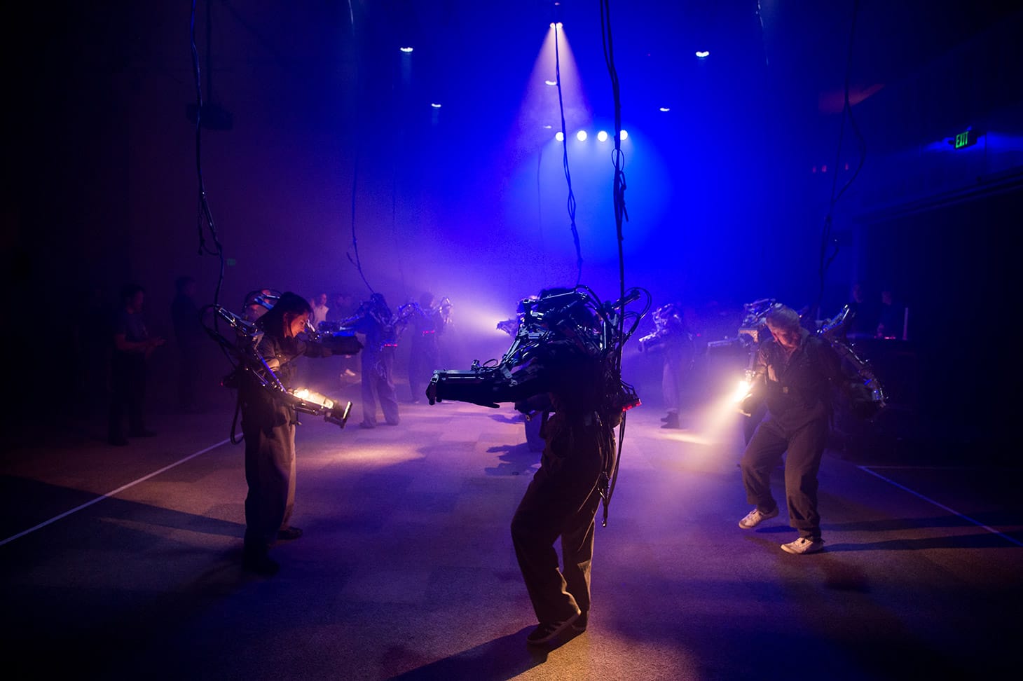 The compelling interplay between human and machine gets lost, however, in Inferno’s production design. Scored live by Vorn’s industrial electronic music, the stage matches the soundscape with darkness interrupted by strobing lights and a rolling fog that often obscures the performers. The room feels like an underground rave, and given the rarity of fully mechanized robotic dancers, witnessing the spectacle does make you feel like you’re at the forefront of culture, previewing the future of entertainment. But in this symbiotic collaboration between people and exoskeletons, the idiosyncrasies of human behavior are subdued to make the engineering triumph stand out.
